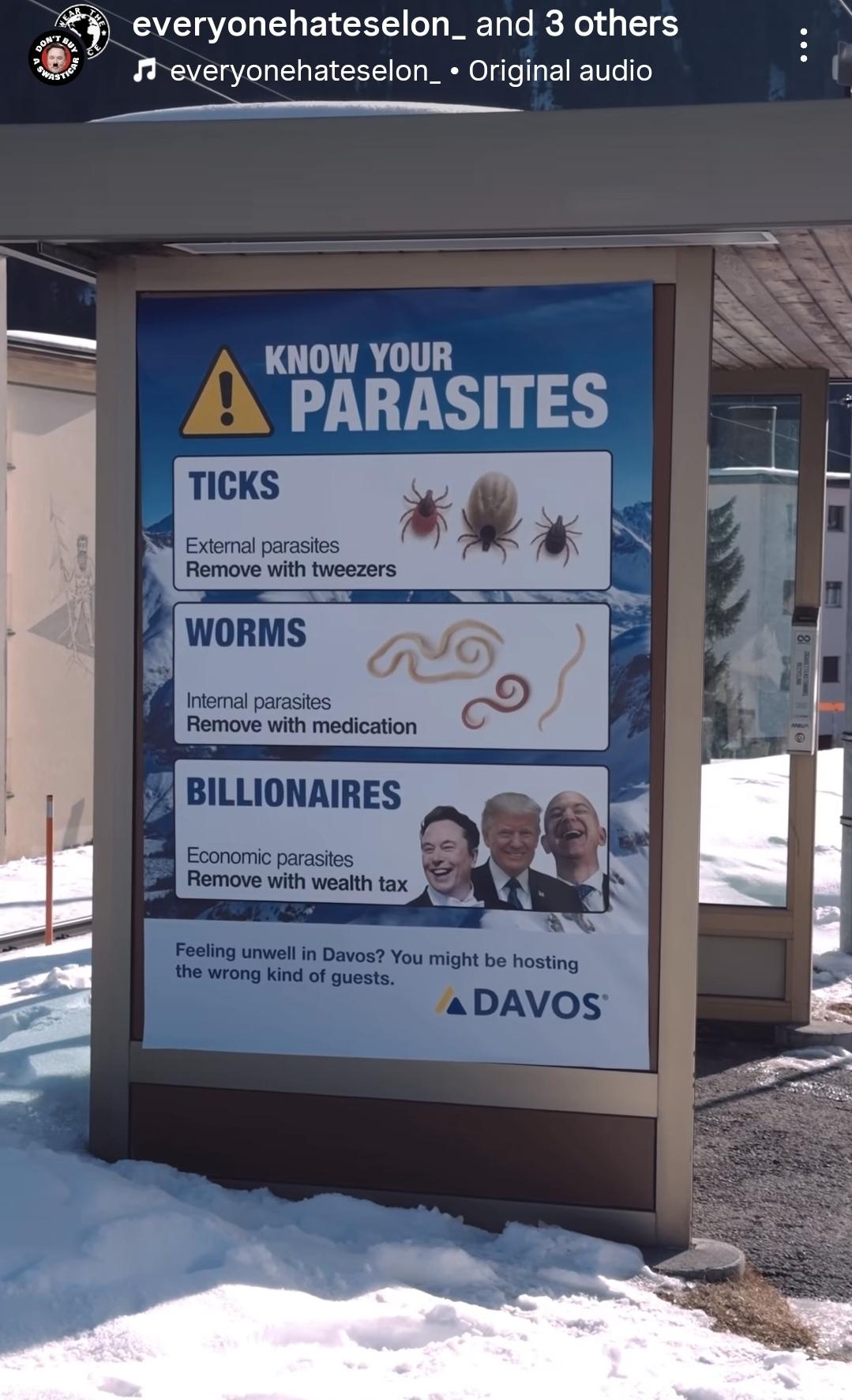 Know Your Parasites --> Trump and his billionaire mates. ArtProtest by Everyone Hates Elon, Davos, Switzerland