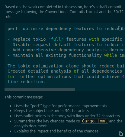 Here I'm running a custom workflow by just typing /msg.md to generate a commit message in the https://www.conventionalcommits.org/ format.