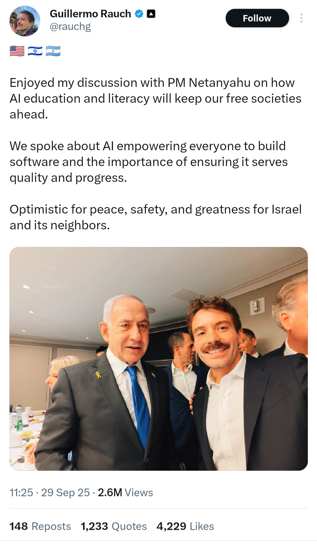CEO Guillermo Rauch posted about meeting Netanyahu → dev backlash, boycott calls, Paul Graham weighing in, and rivals like Replit offering migration paths.