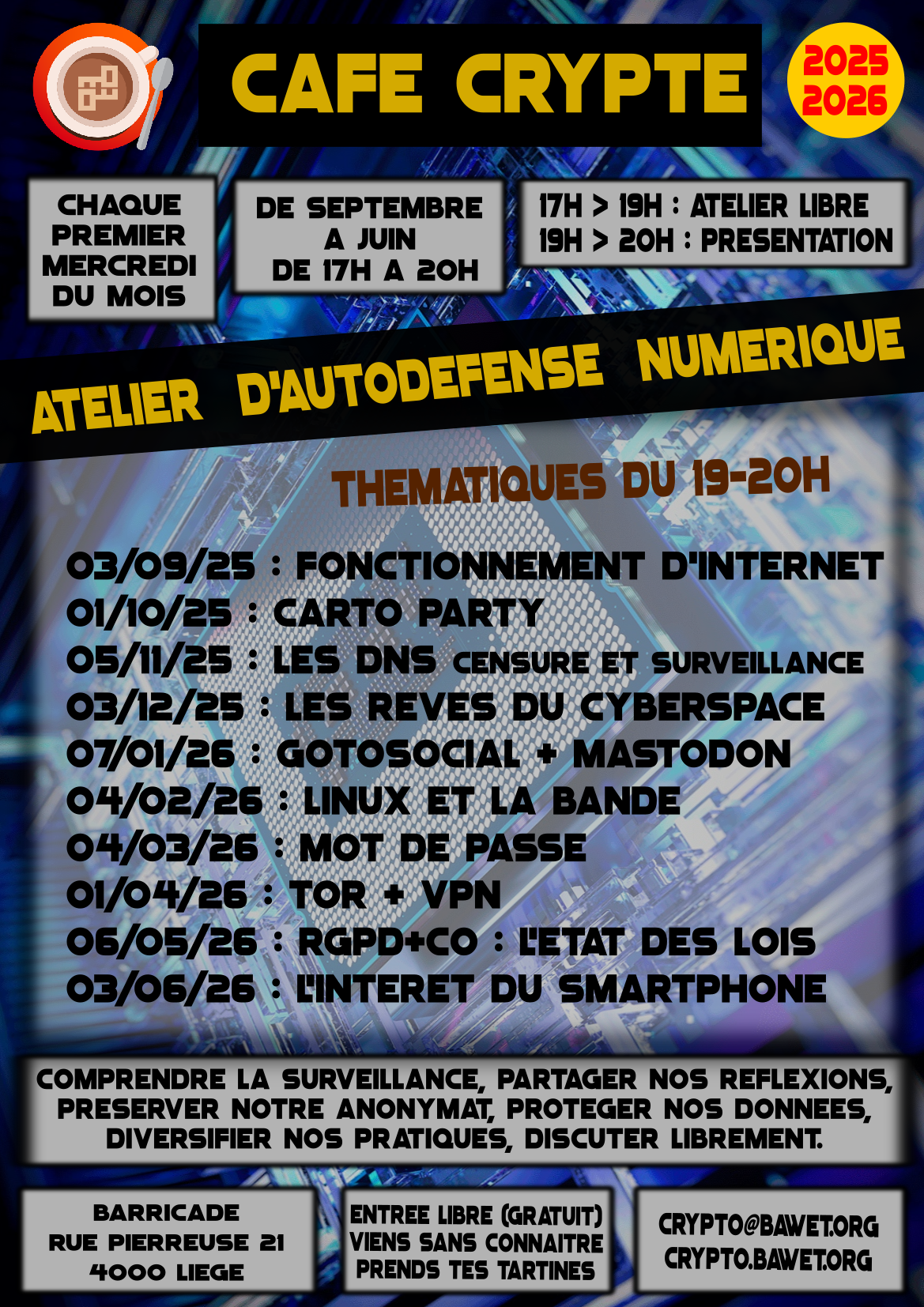 Et voila, nouvelle affiche pour les cafés d'autodéfense numérique de Liege pour cette année scolaire. Le premier déjà dans deux semaines! #adn #liege#autodéfense #cryptoparty#cafécrypté #confidentialite