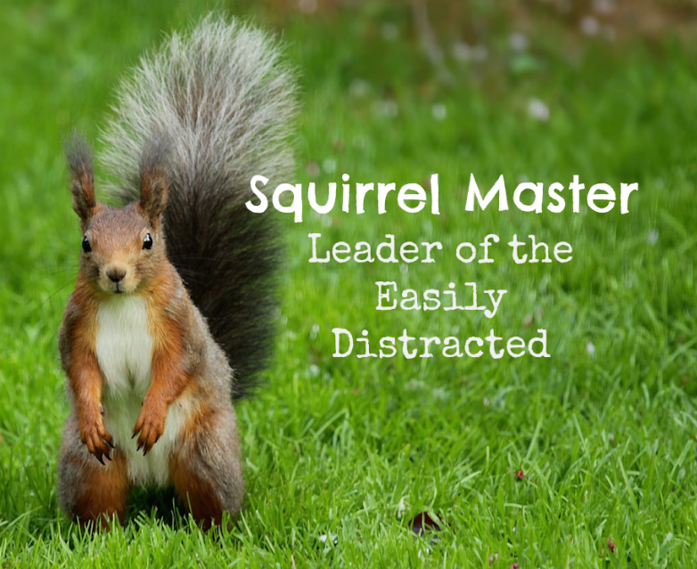 Picture a red squirrel standing in a grassy field looking at us. The caption reads: “Squirrel Master, Leader of the Easily Distracted” CREDIT: DDG find