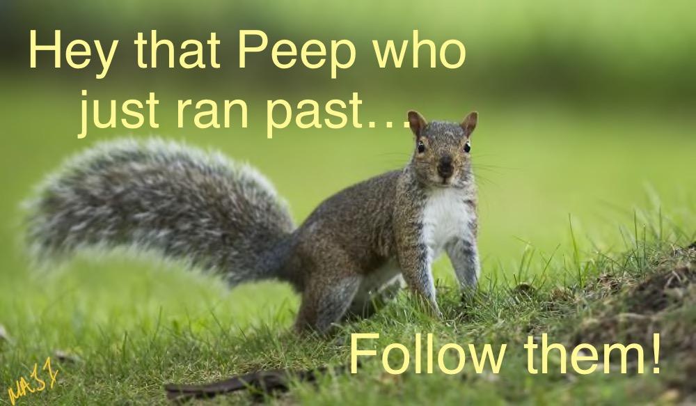 Picture a grey squirrel in a field looking at you saying: “Hey that Peep who just ran past… Follow them !