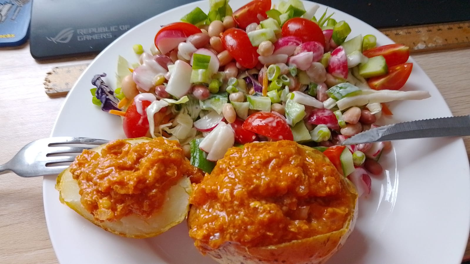 Dinner: salad and roast spud with a can of cat food on top.
