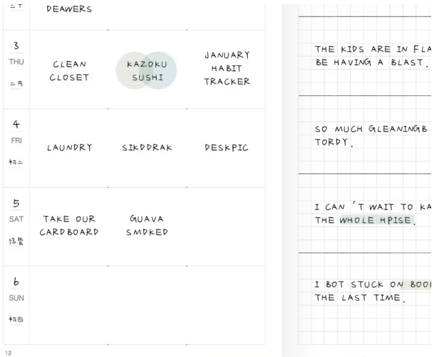 faux handwritten text in a day planned that is riddled with strange spelling errors, such as "sikddrak", "so much gleaningb tordy" and "the whole hpise"