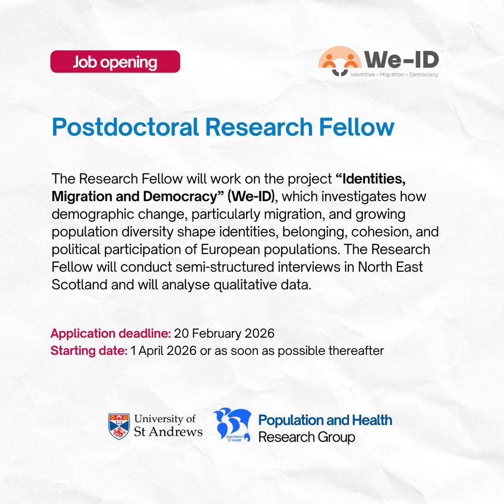 #Job alert 💼 The School of #Geography & Sustainable #Development, University of St Andrews is seeking to appoint a #ResearchFellow to work on the project “ #Identities, #Migration and #Democracy” ( #We-ID) with CPC-CG Co-Director Professor Hill Kulu and CPC-CG member Dr Sarah Christison.