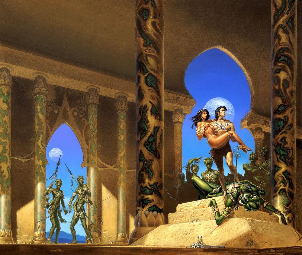 Ruth, a pearl white dragon with green eyes, poses regally with wings spread against a cliff face. Her rider Jaxom rears back, saddle-mounted just above her wings. A foreclaw grips rock as the other releases, flexing like fingers. Ruth's tail, marked with a parallel ridges of short spikes and ending in a spade-shaped tip, curls forward around her back leg. A tiny dragon grasps Jaxom's finger, perching like a bird. Across the misty valley, a group of dragons take flight, soaring past the Red Star which hangs in deep blue sky like a bloody moon just above the jagged spine of mountains.