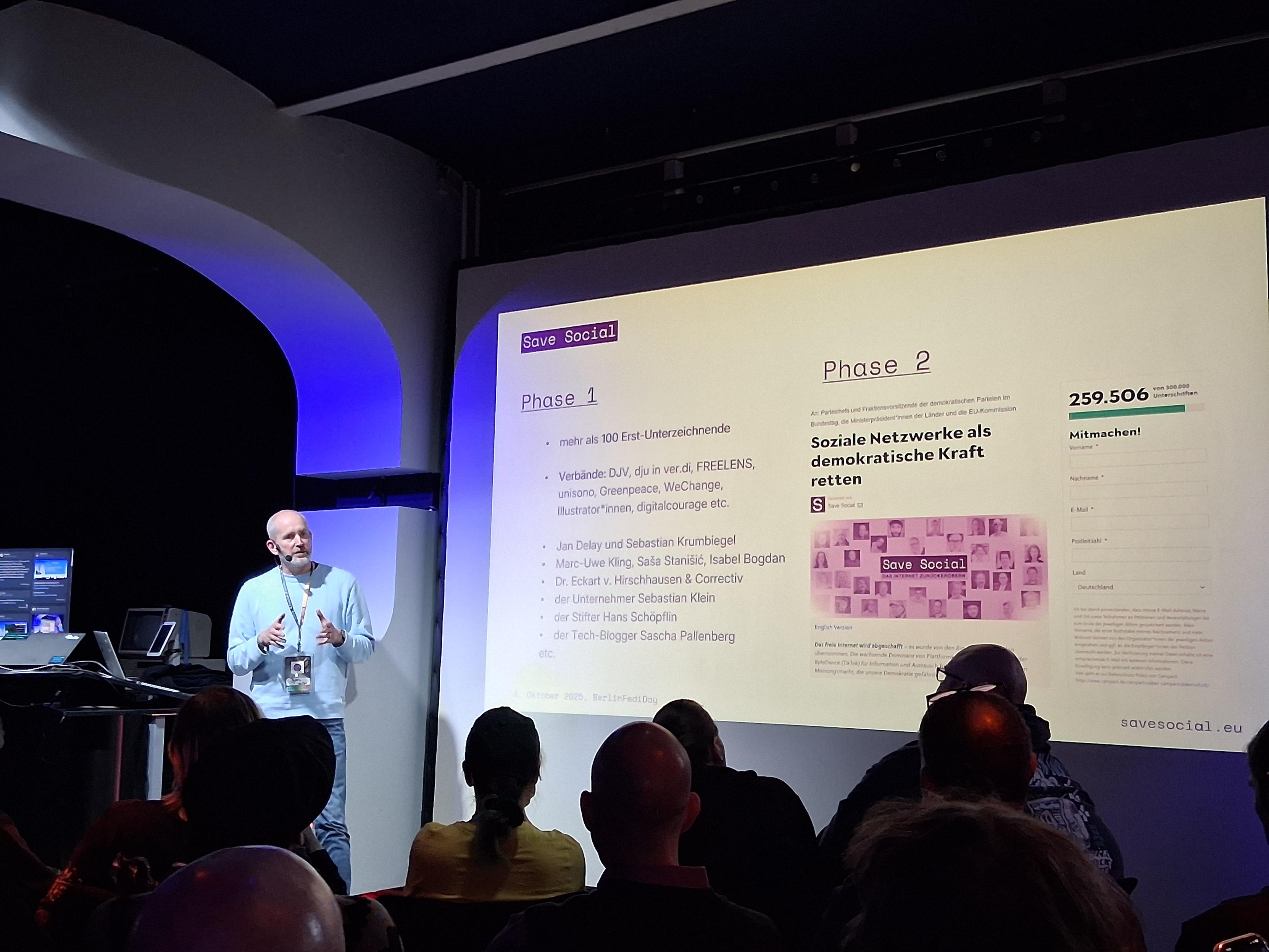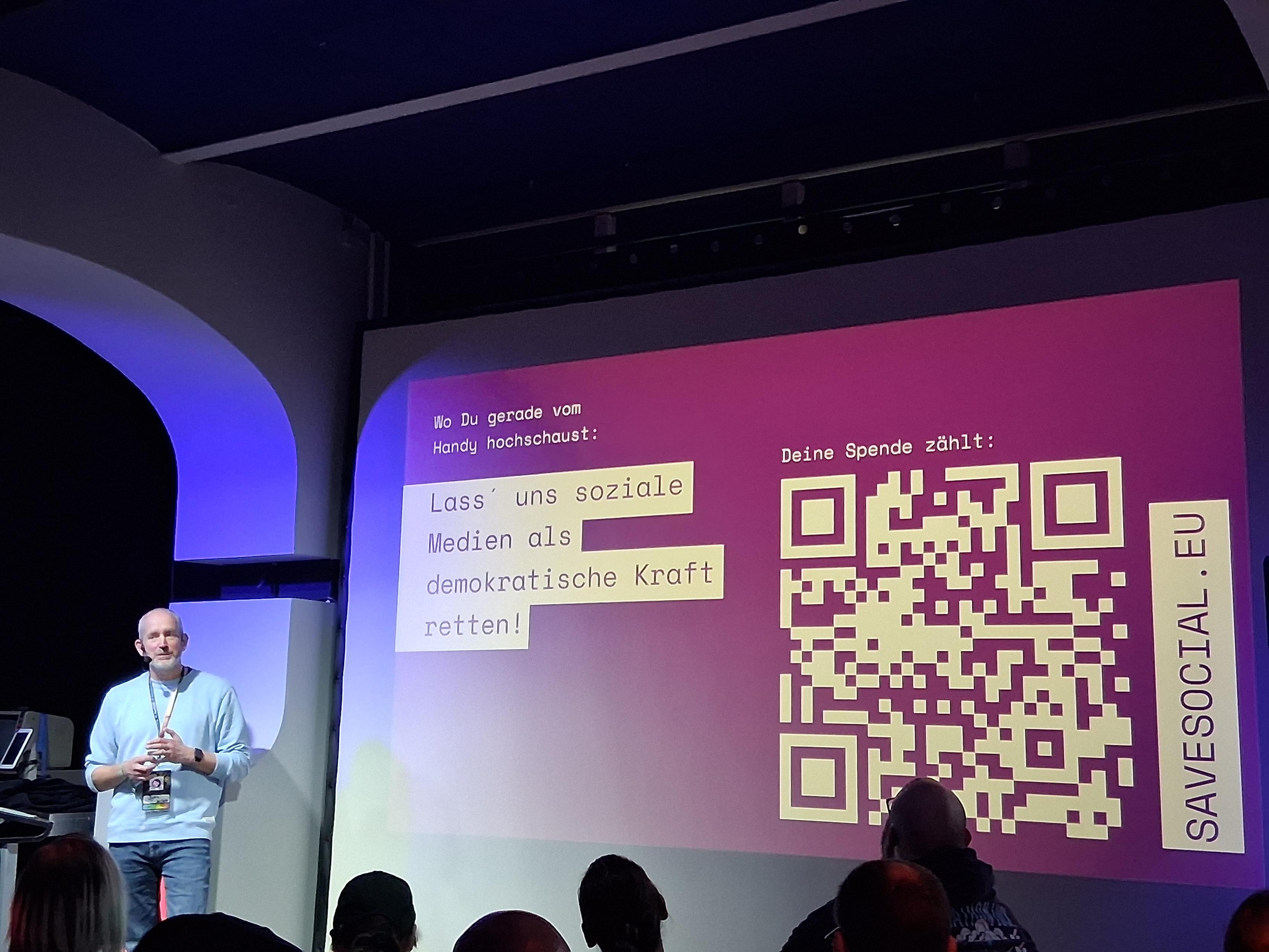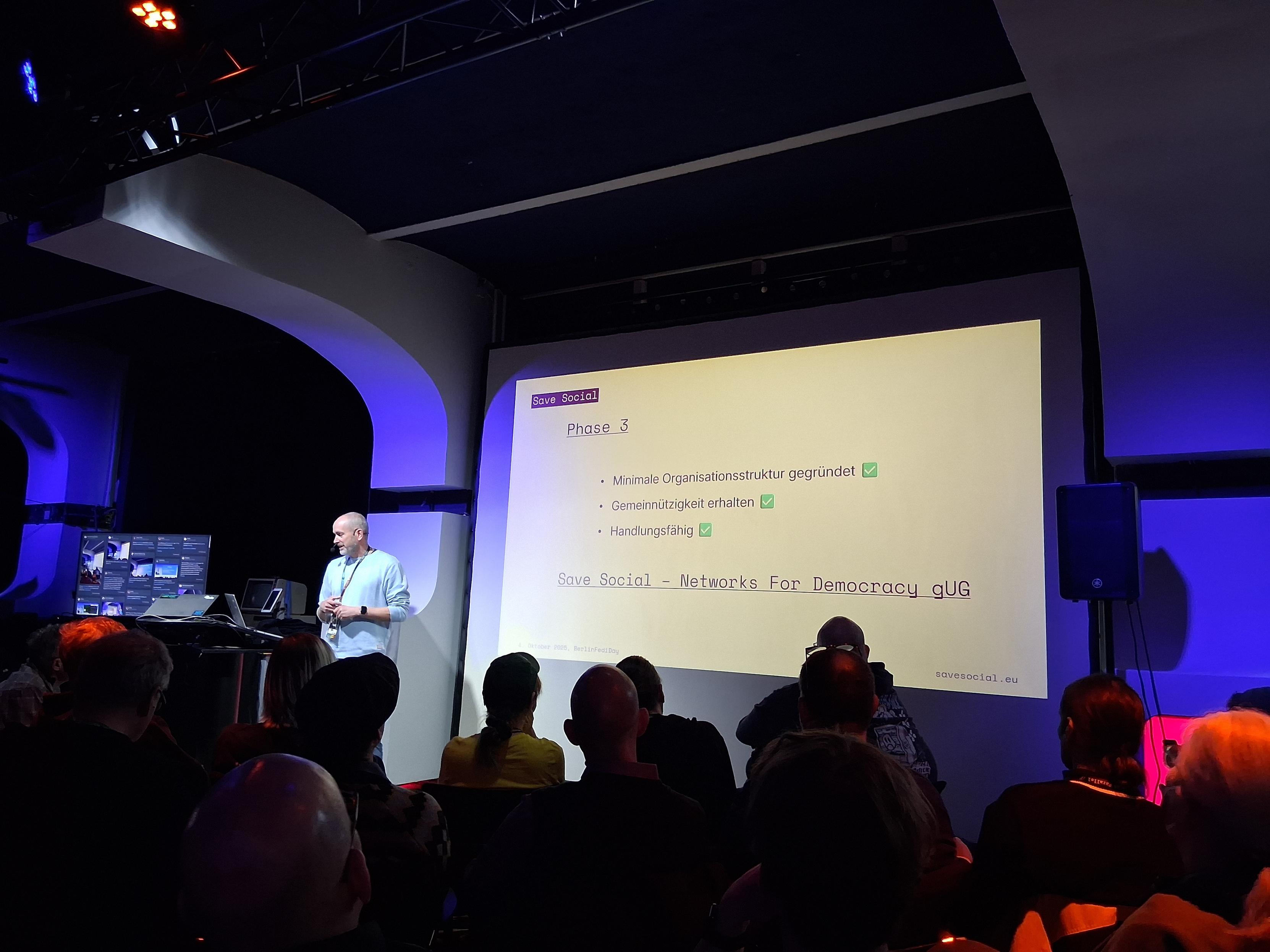 @bjoernsta stellte gerade den Stand von https://savesocial.eu beim #FediDay in Berlin vor - lasst uns das Ganze gemeinsam GROSS machen! ✊️🚀