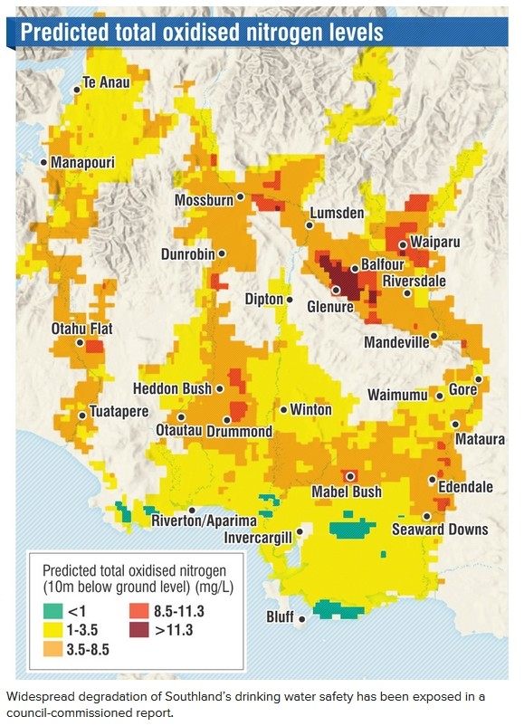 A report commissioned by Environment Southland shows "widespread degradation of Southland’s drinking water" with dangerous levels of nitrates through almost all of the area's waterways.