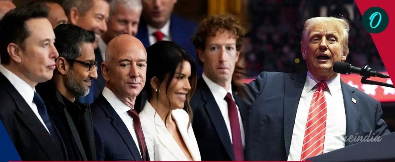 A combination of two photos - on the right Trump, on the left Musk, Pichai, Bezos with his fiancee Sánchez, and Zuckerberg