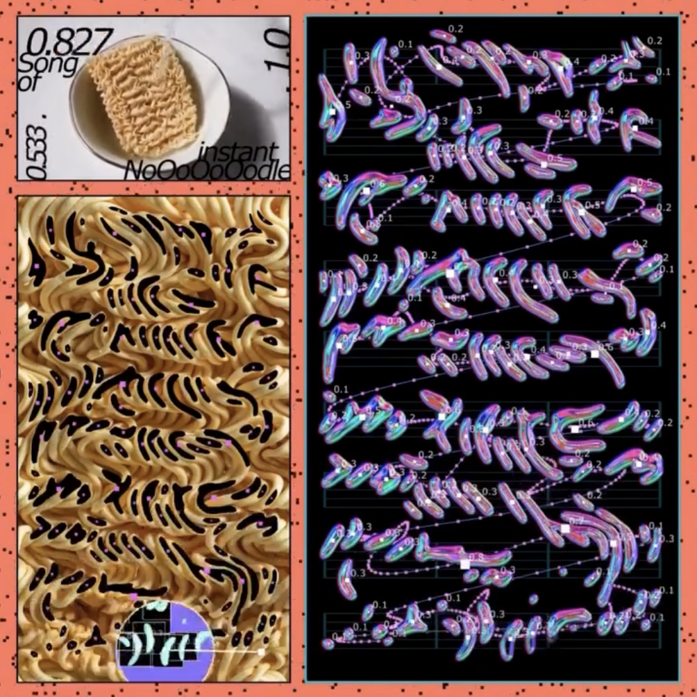 "Although instant noodles are industrial products, the process of making and transporting them gives each block a unique form. I imagine the square-shaped noodle brick as a musical score, with the twisted noodles themselves acting as notes."