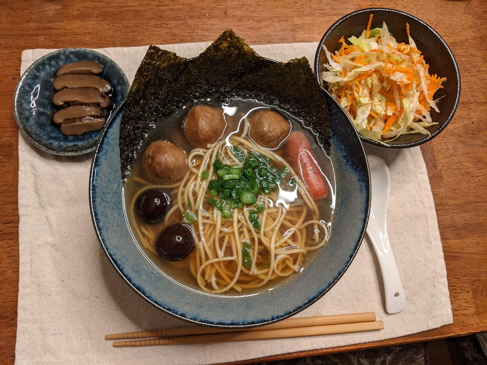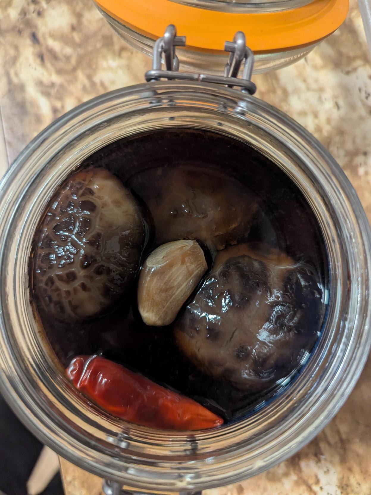 Had to dilute the sous vide bag stock and enhance only a bit for a lovely broth to go with ho hum boiled up 'ramen' noodles - store bought hot pot meatballs and sausage, had since languishing (store) salted soy quail eggs so just used those. Broth was really good and the home pickled shiitake (h/t @LifeTimeCooking ) a robust accompaniment, along with simple salad - and that was #Dinner