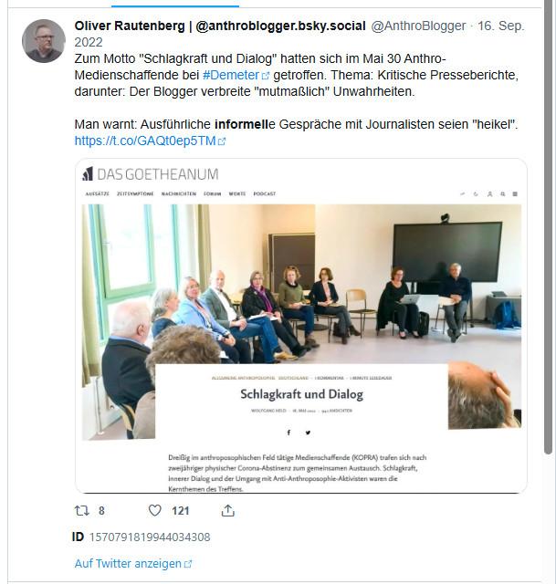 Mehr noch: Im Hause #Demeter trafen sich 2022 dreißig Medienschaffende aus der Anthroposophie (Waldorfschule, Weleda und Co.), um das Vorgehen gegen einen kritischen Blogger (hüstel) abzustimmen.