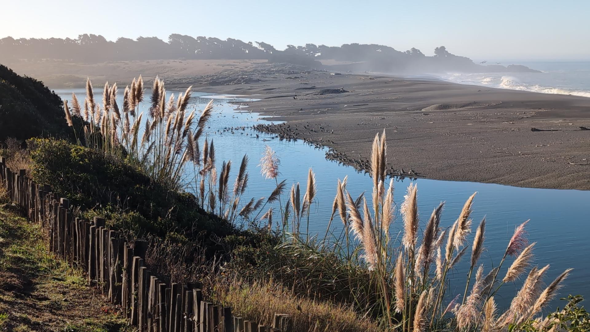 Gualala River meets the coastline. Pompous Grass along the shore. A wood fence is along left side.
