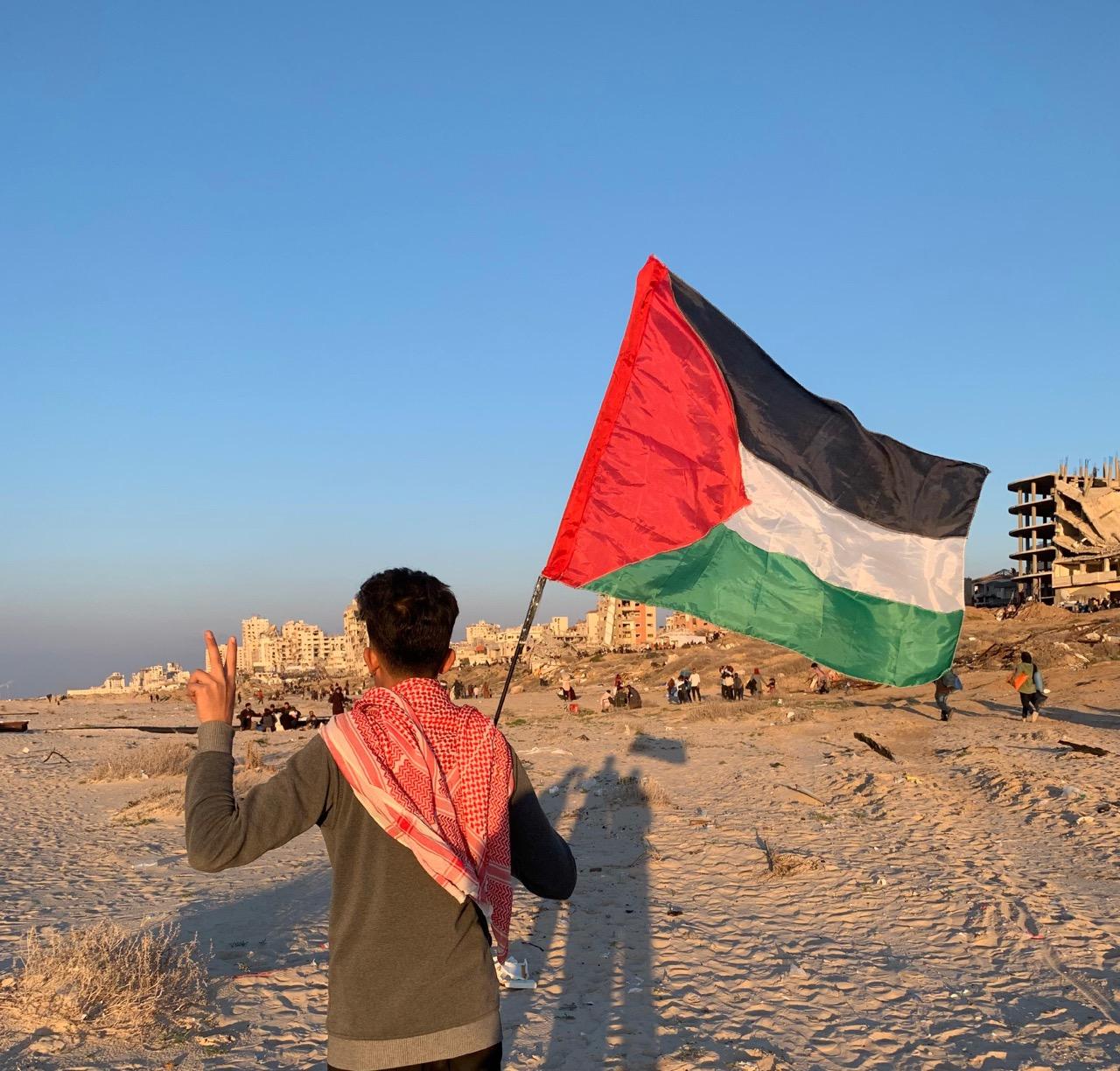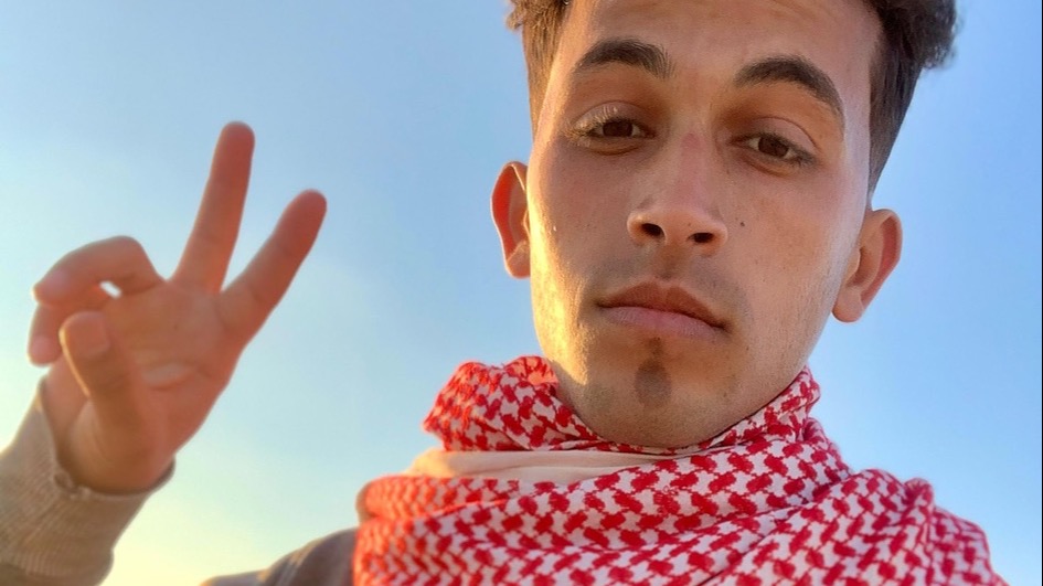 Mohammed Shobair, 22 years old, from Gaza City, wearing a kufiya and doing a peace sign with my fingers. This is a video from a few months ago, when we returned to Gaza City after months in Rafah.