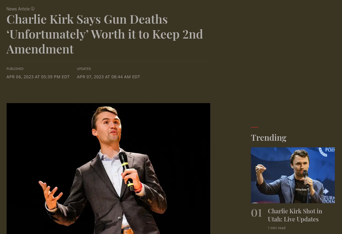 A screenshot from an article with the headline "Charlie Kirk Says Gun Deaths ‘Unfortunately’ Worth it to Keep 2nd Amendment". In the margin to the right of the article is the number one trending article right now, with the headline "Charlie Kirk shot in Utah"