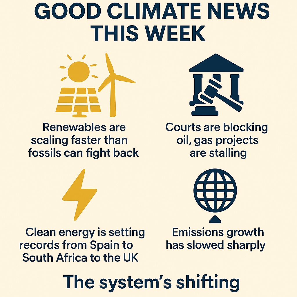The tide’s finally turning. Renewables are scaling faster than fossils can fight back. Courts are blocking oil, gas projects are stalling, and clean energy is setting records from Spain to South Africa to the UK. Emissions growth has slowed sharply. The system’s shifting. 🌍⚡ #ClimateHope #Disruption