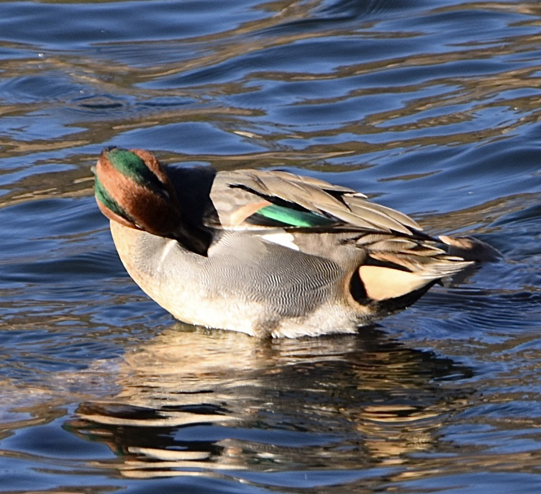 A preening Green-winged Teal shows off his emerald patches of plumage.