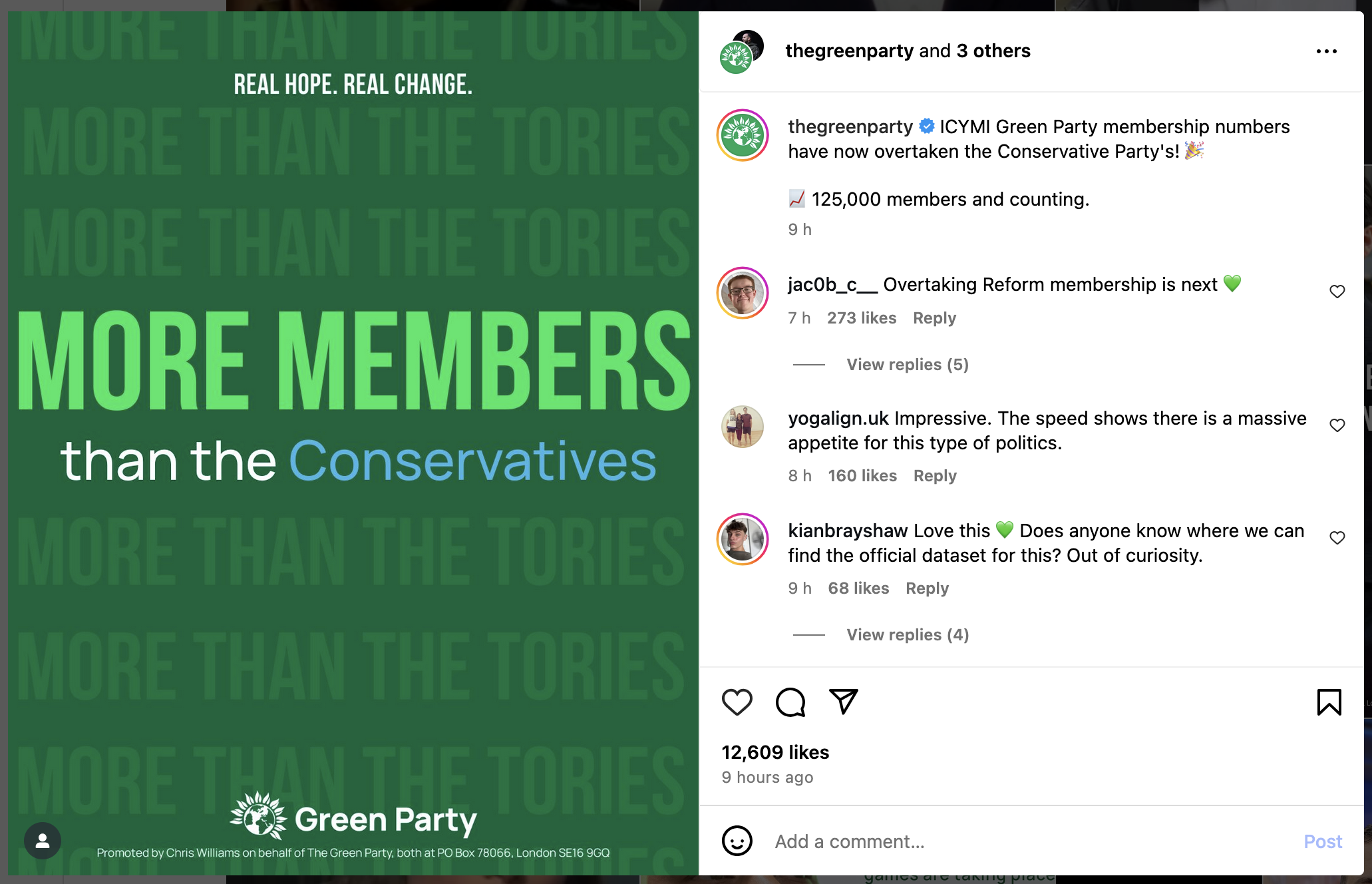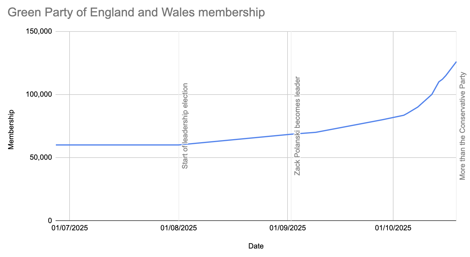 The Green Party of England and Wales has now overtaken the Conservative Party for number of party members, reaching 126,000 today!