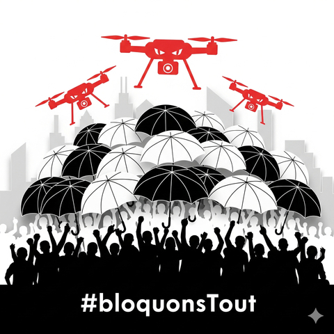 Des pedestrians avec une banderole BLOQUONS TOUT tiennent des parapluies pour se protéger de la vidéo surveillance par un drone dont la caméra est symbolisée par un oeil, qui vole au-dessus d'eux.