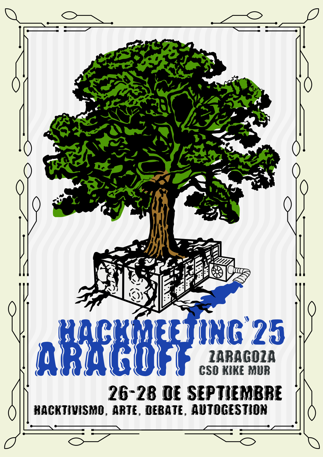 cartel del hackmeeting 2025, AragOFF. Aparece un roble enorme creciendo encima de unos armarios de servidores. Sus raíces bajan por los laterales y hasta tocan el agua que sale o entra con una turbina hacia los servidores. Conectando con el agua azul, unas letras onduladas ponen HACKMEETING '25 ARAGOFF. En negro, Zaragoza, CSO Kike Mur. 26-28 de septiembre. Hacktivismo, arte, debate, autogestión.
