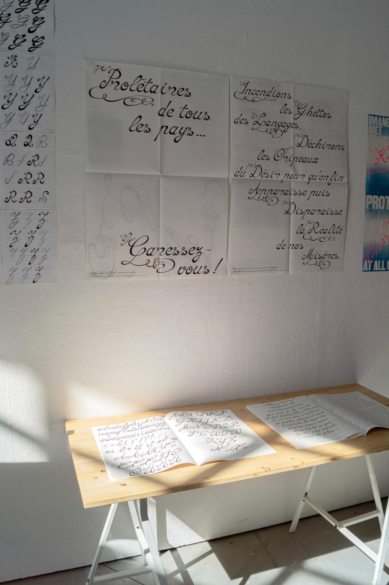 Photographie ensoleillée d'une table avec des spécimes ouverts du caractère interlope et quelques affiches sur le mur.