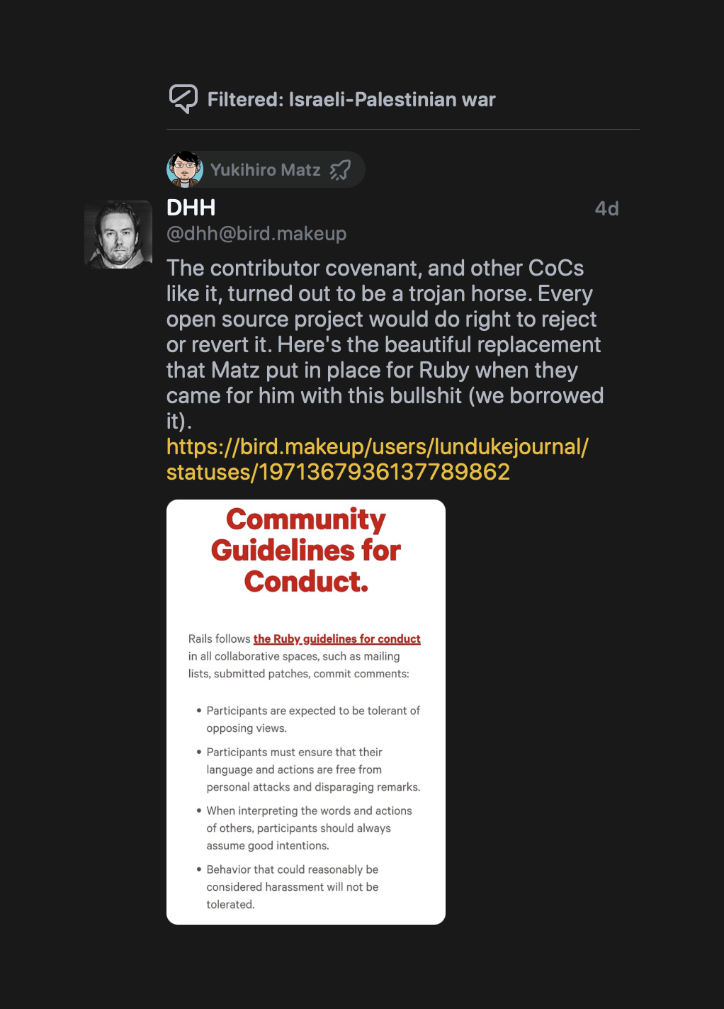His point is that principle-based short community guidelines are better than detailed CoC like the Contributor Covenant. He specifically highlights “the beautiful replacement that Matz put in place for Ruby when they came for him with this bullshit”: https://rubyonrails.org/conduct