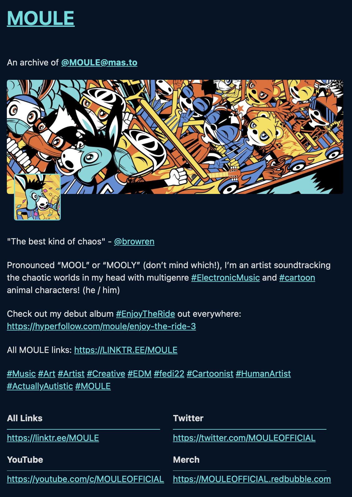 Screenshot of my public mas.to archive made thanks to Posty. I've changed the CSS to have the background navy blue and the borders and link text light blue (it's by default a grey background with yellow link text). The profile picture shows MOULE, an anthropomorphic turquoise cartoon mule, with black shaggy hair and a darker blue hoodie, smiling and dancing in front of a yellow background. The banner art is a portion of my album artwork I made for Enjoy the Ride, showing several anthropomorphic cartoon animal characters happily riding down a rollercoaster. The description reads: ""The best kind of chaos" - @browren "Pronounced "MOOL" or "MOOLY" (don't mind which!), l'm an artist soundtracking the chaotic worlds in my head with multigenre #ElectronicMusic and #cartoon animal characters! (he / him) "Check out my debut album #EnjoyTheRide out everywhere: https://hyperfollow.com/moule/enjgy-the-ride-3 "All MOULE links: https://LINKTR.EE/MOULE "#Music #Art #Artist #Creative #EDM #fedi22 #Cartoonist #HumanArtist #ActuallyAutistic #MOULE" There are links to my now-deleted Linktree and Twitter account, as well as links to my current YouTube and Redbubble accounts.