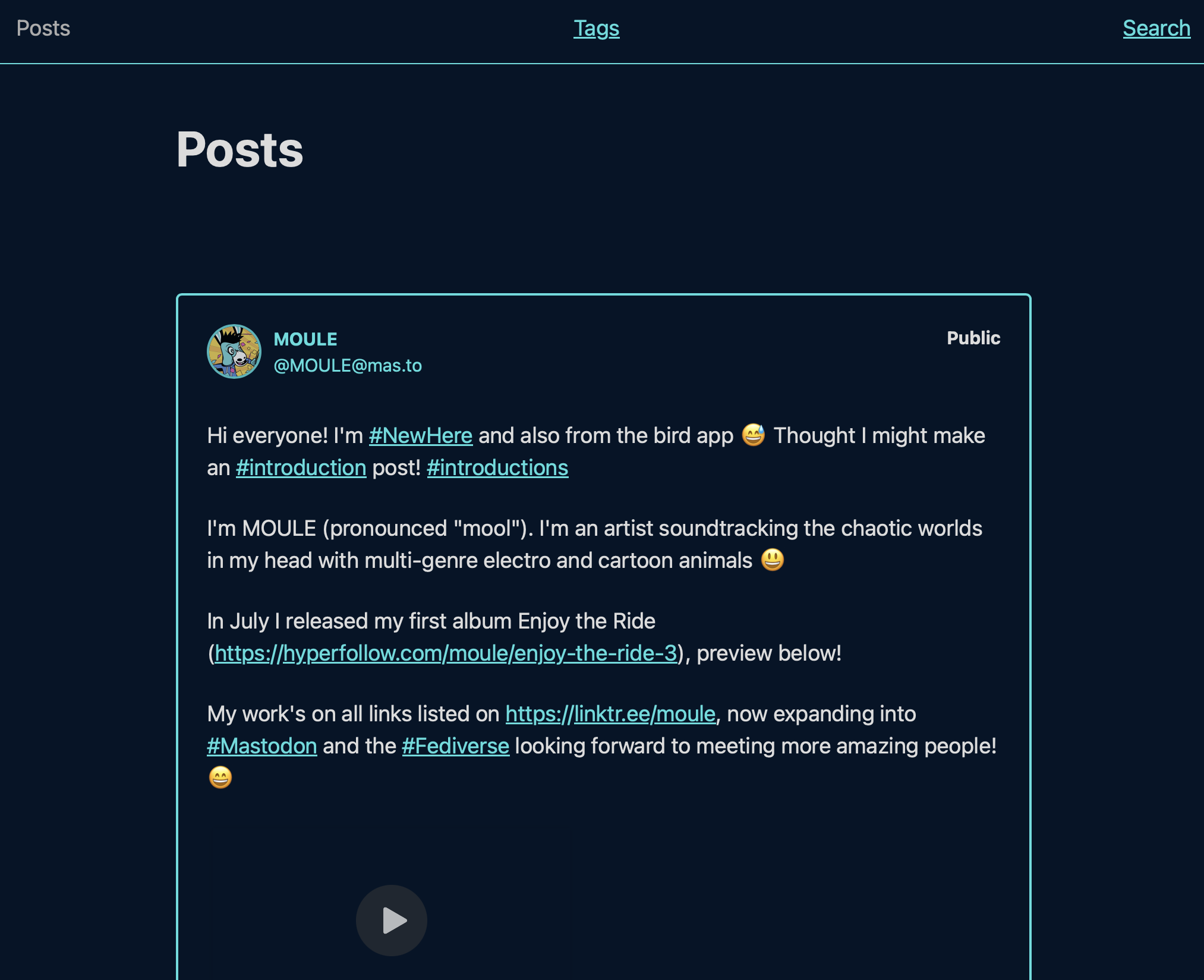 Screenshot of my first post I made on mas.to, viewed on my mas.to archive. It reads: "Hi everyone! I'm [hashtag] NewHere and also from the bird app [happy sweat emoji] Thought I might make an #introduction post! [hashtag] introductions "I'm MOULE (pronounced "mool"). I'm an artist soundtracking the chaotic worlds in my head with multi-genre electro and cartoon animals! [happy emoji] "In July I released my first album Enjoy the Ride (https://hyperfollow.com/moule/enjoy-the-ride-3), preview below! "My work's on all links listed on https://linktr.ee/moule, now expanding into [hashtag] Mastodon and the [hashtag] Fediverse looking forward to meeting more amazing people! [happy eyes closed emoji]" Below that is a video playing one second from every track in my first album, "Enjoy the Ride".
