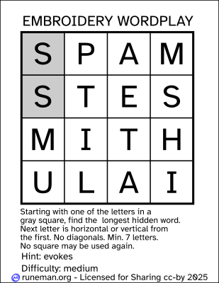 Embroidery Wordplay a one-word word search puzzle hint: evokes difficulty: medium Letter grid: S* P A M S* T E S M I T H U L A I letters marked with an asterisk indicate the potential starting points for the word. The image shows them with a gray background.
