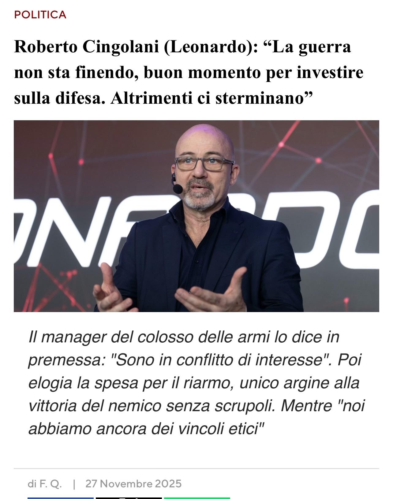 Si può dire che i #Cingolani, i #Minniti e tutti gli altri pupazzi di finta sinistra piazzati nell’industria armiera mi hanno sterminato gli zebedei col loro terrorismo psicologico militarista in palese conflitto di interessi?