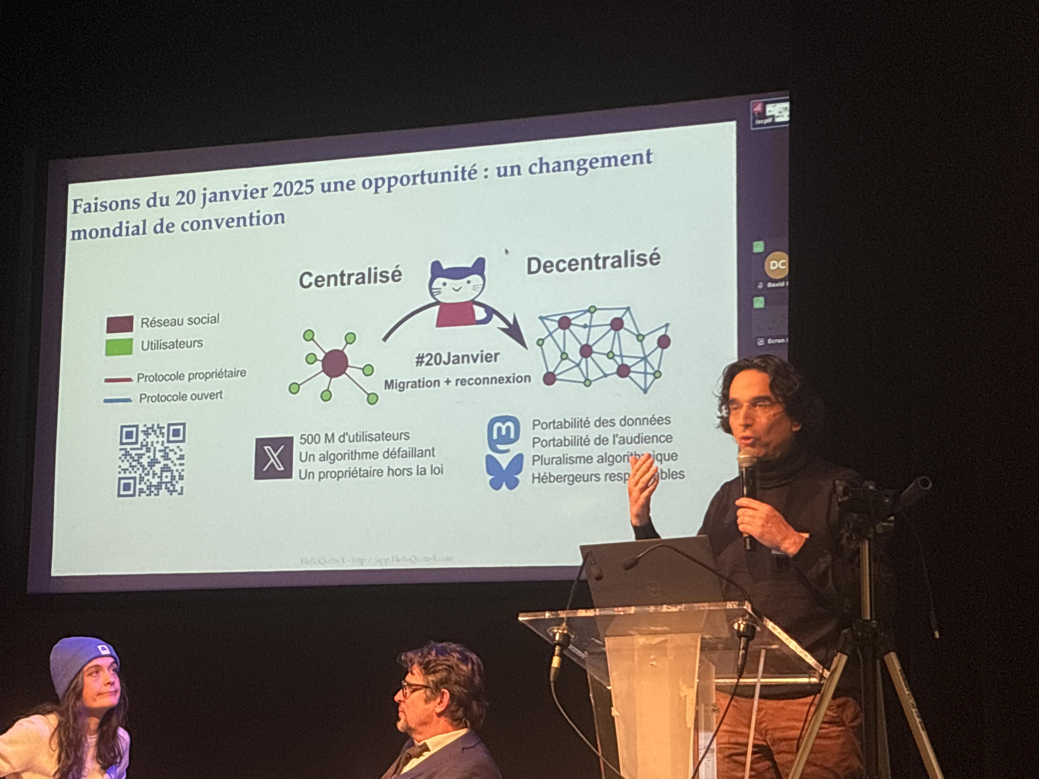 Au tour de David Chavalarias, comme intervenant cette fois. « Les États-Unis disent si vous touchez à X on sort de l’Otan. » il re-explique # HelloQuitX et #OpenPortability. « Le problème est qu’il faut des espaces d’arrivée plus intéressants que les espaces de départ. Si on veut découvrir de nouveaux territoires, il faut des cartes ! Voici une présentation avec 600 000 personnes… »