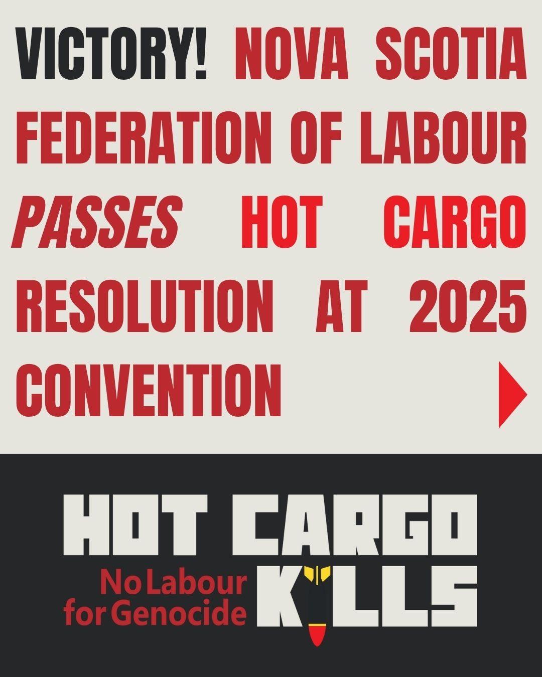 The Nova Scotia Federation of Labour declared its endorsement of the Arms Embargo Now campaign at its conference yesterday, labelling shipments "hot cargo", not to be touched by union workers of conscience.