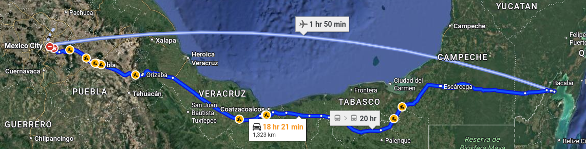 1:50 hours to fly from Tenochtitlan to Chetumal