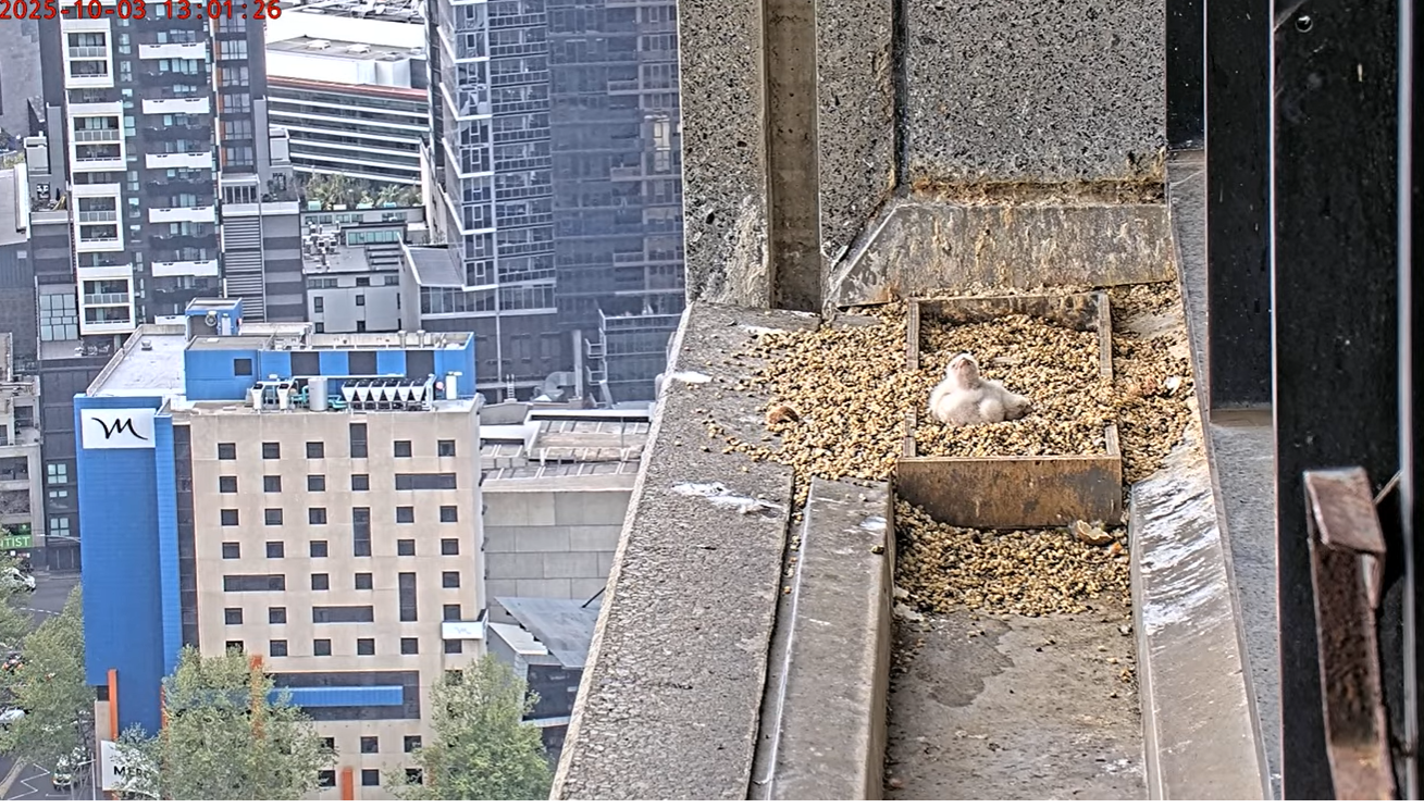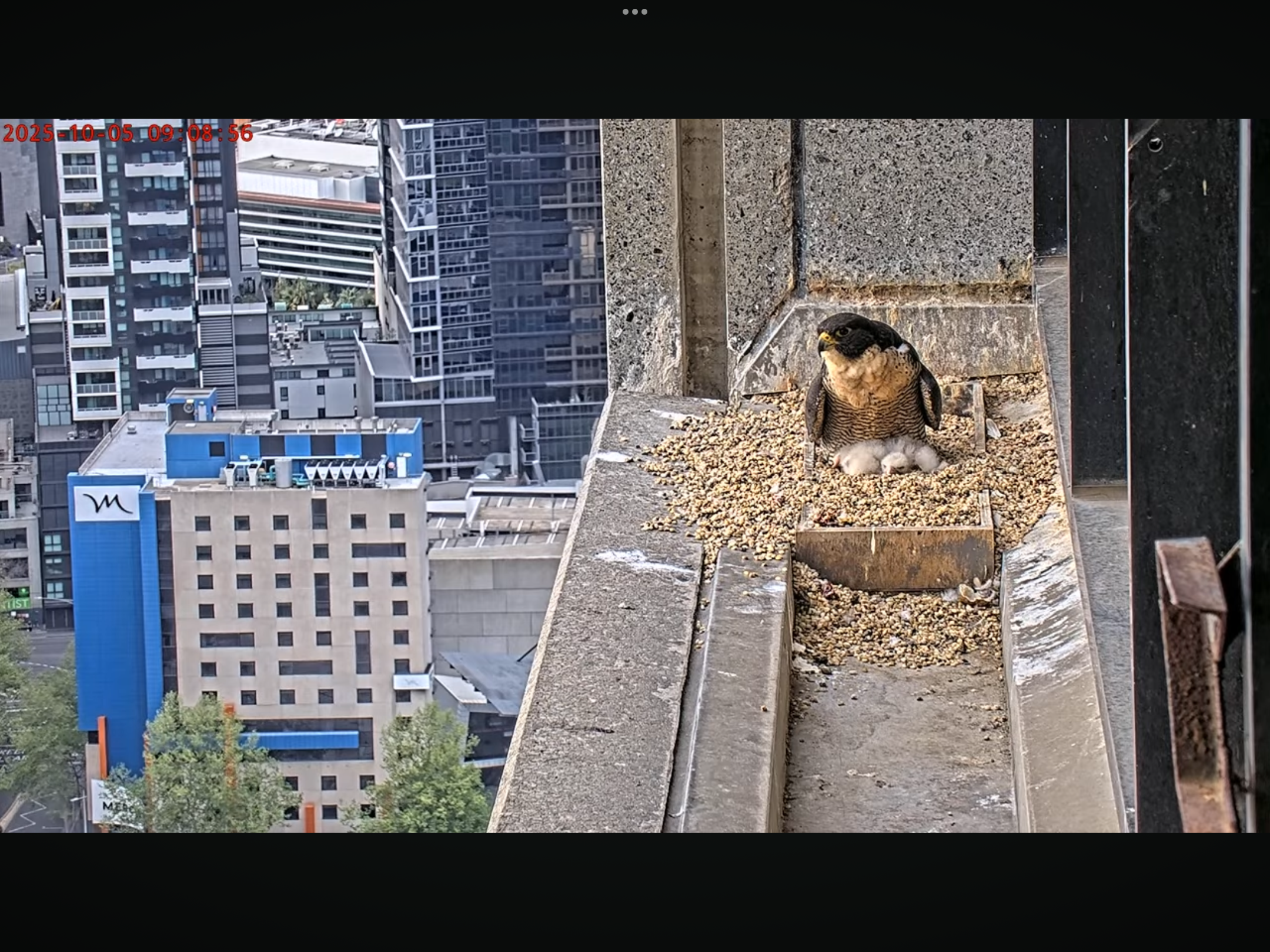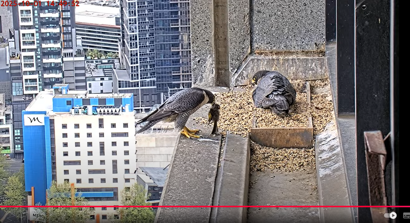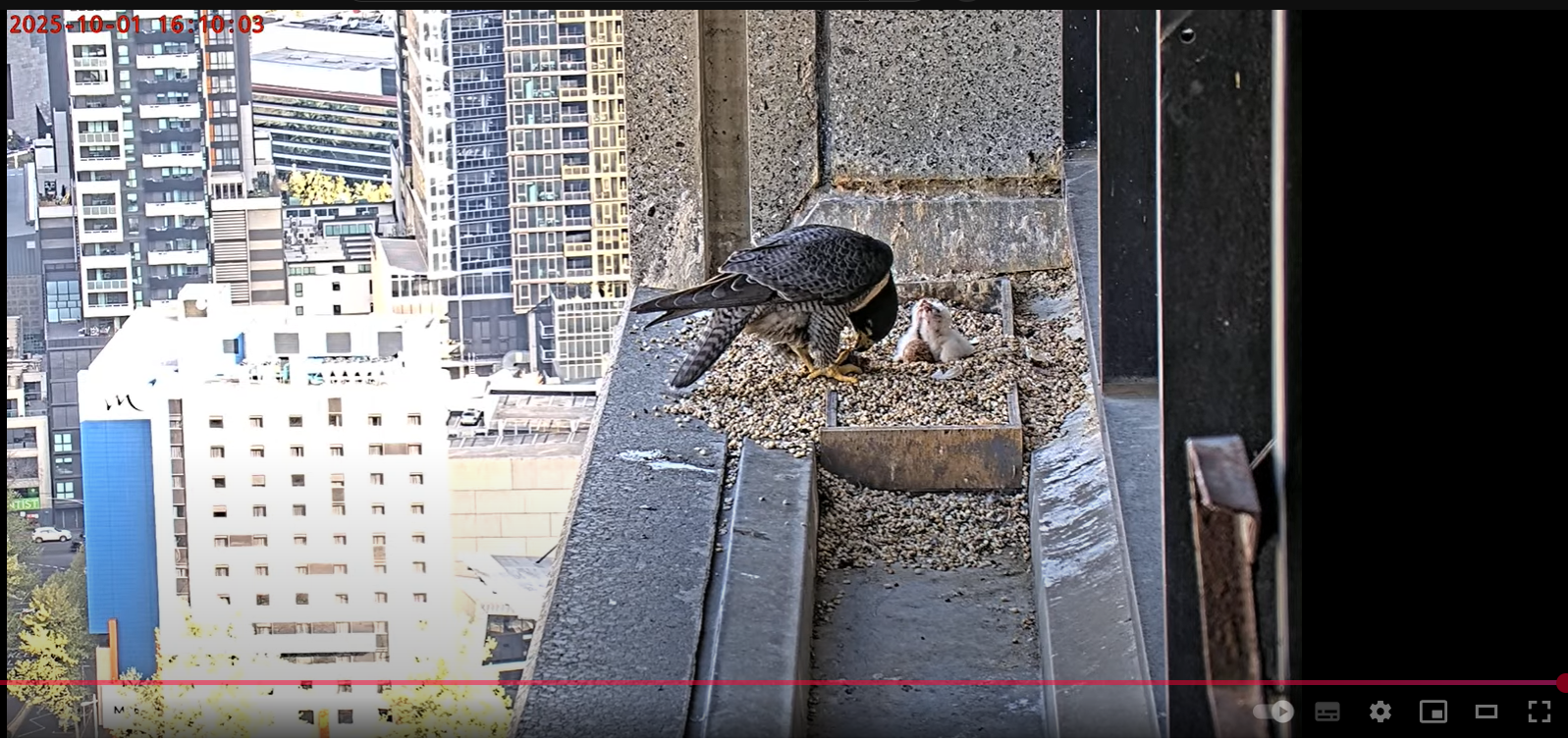Drama at the Collins St Falcon nest today. Dad Falcon dragged up a New Holland Honeyeater (not common in the city) but not what momma Falcon feels like while she sits on her newly hatched babies so he took it away