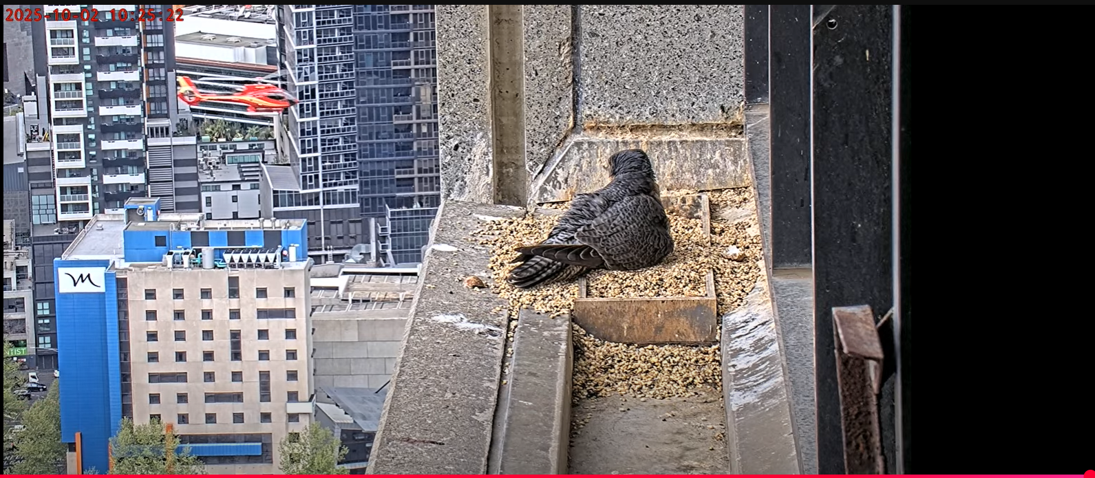 A Collins St Falcon parent ponders a threat to their domination of the skies above the yarra as they sit on their chicks