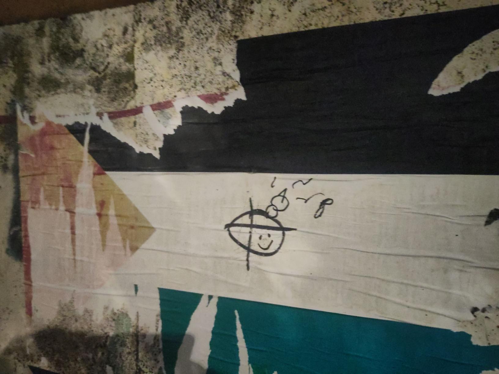Qualche anonimo fascistello (*) ha strappato le bandiere palestinesi sotto casa, disegnandoci sopra delle celtiche. Per fortuna passavo con la mia baby gang preferita e un uniposca in tasca ce l'ho sempre per cui è partito l'art attack.