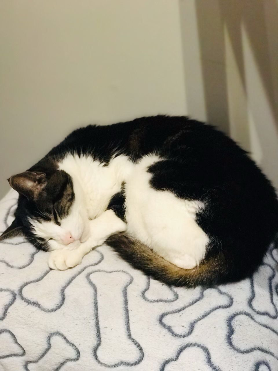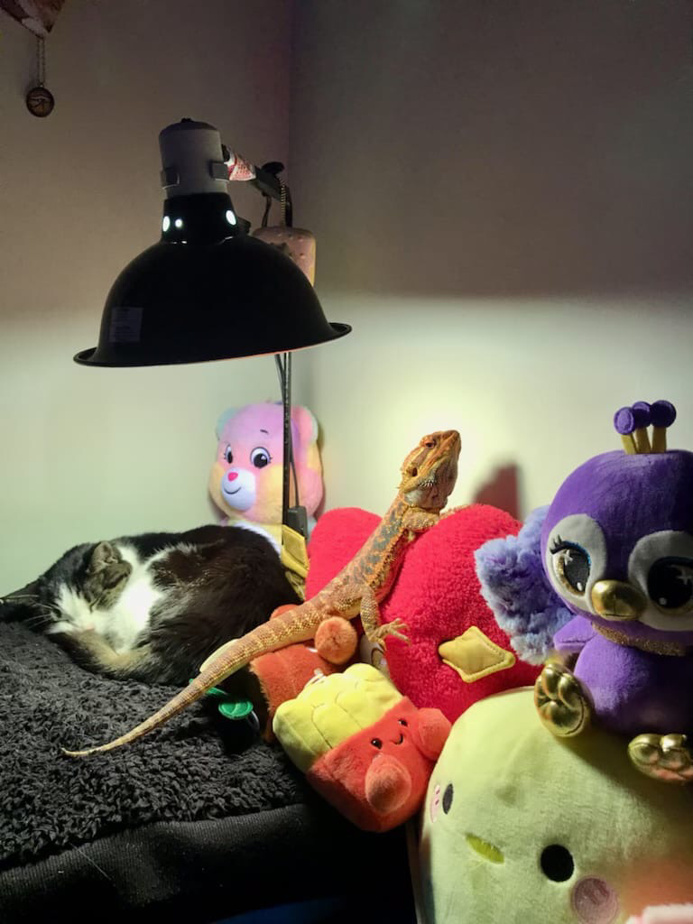 They sent me this photo of my dearly departed rescue cat sleeping under the reptile basking lamp where it’s nice and warm! Bearded dragon happily sitting beside kitty, atop a Valentine’s pillow. Love seeing this beautiful memory! ☺️ RIP La Vita 🐾 #tuxedocat #eepy #petphotography
