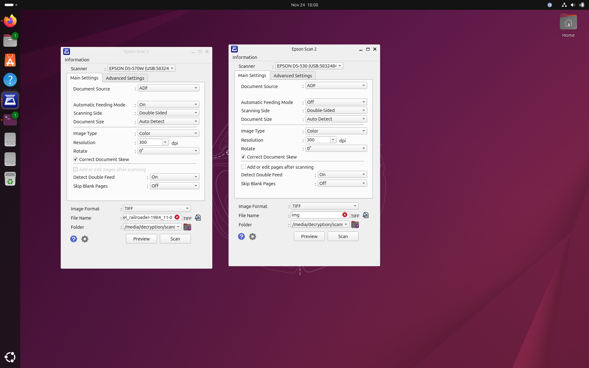 they said it couldnt be done - two instances of epsonscan2 running at the same time (one benefit of running linux, can't do it in windows)
