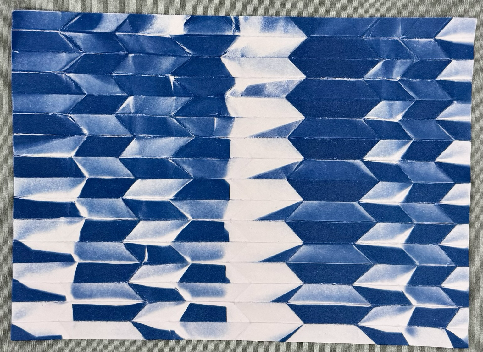 Folded some origami with curved creases and miura ori pattern on cyanotype paper. Put it outside to get some sun. Washed and flattened, this is what they look like.