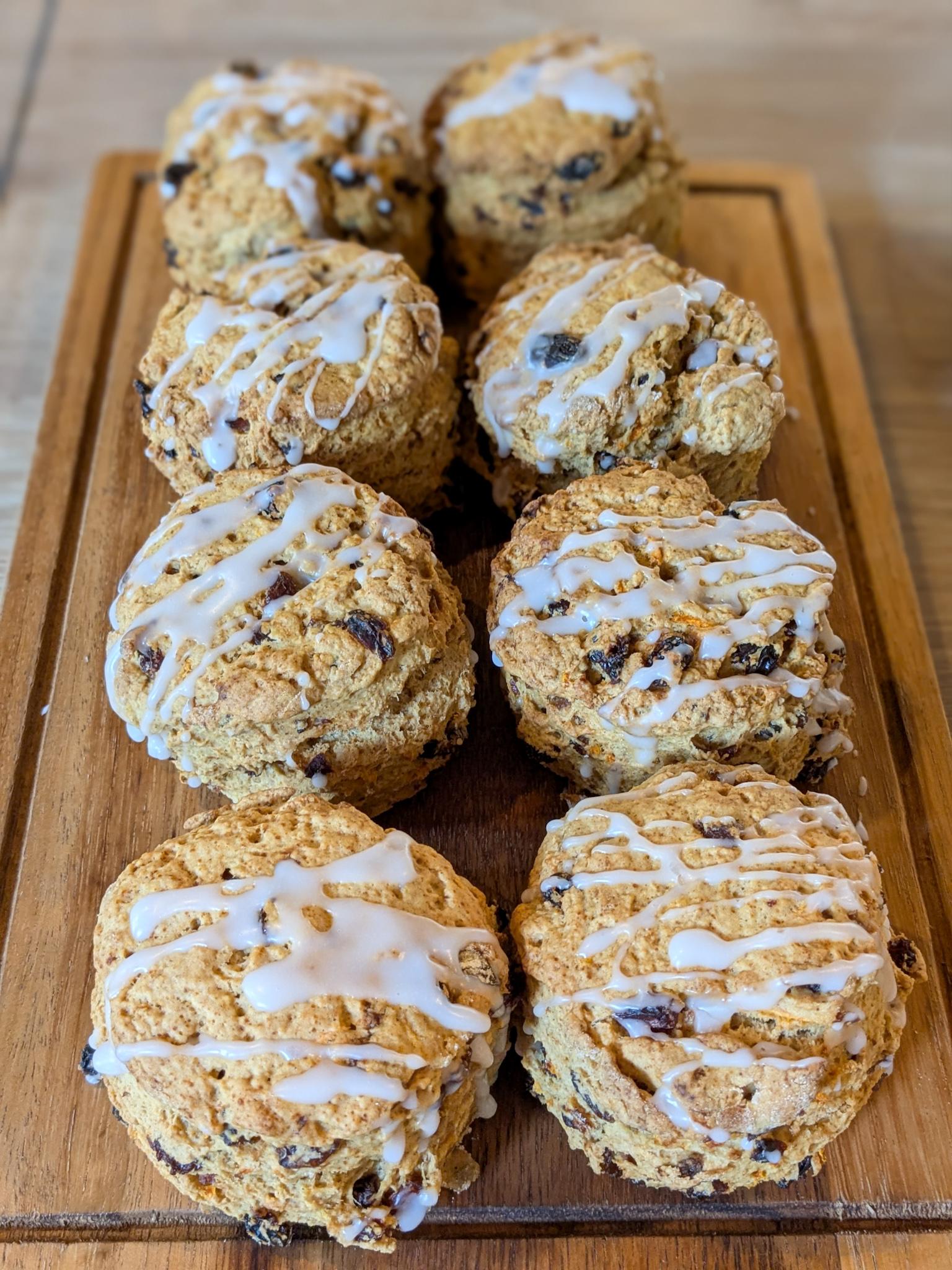 alt Colour photograph of a wooden board on which sit eight golden brown scones, with a water icing drizzle. Colour photograph of a wooden board on which sit eight golden brown scones, with a water icing drizzle.