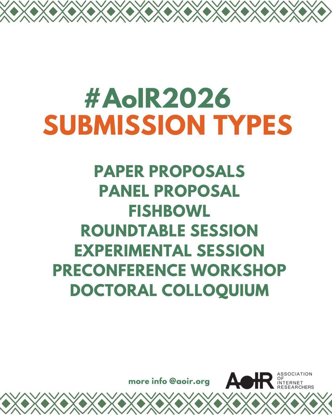 We are welcoming proposals for papers, panels, roundtables, & more! 🔗 Full details of CfP https://aoir.org/aoir2026/aoir2026cfp/