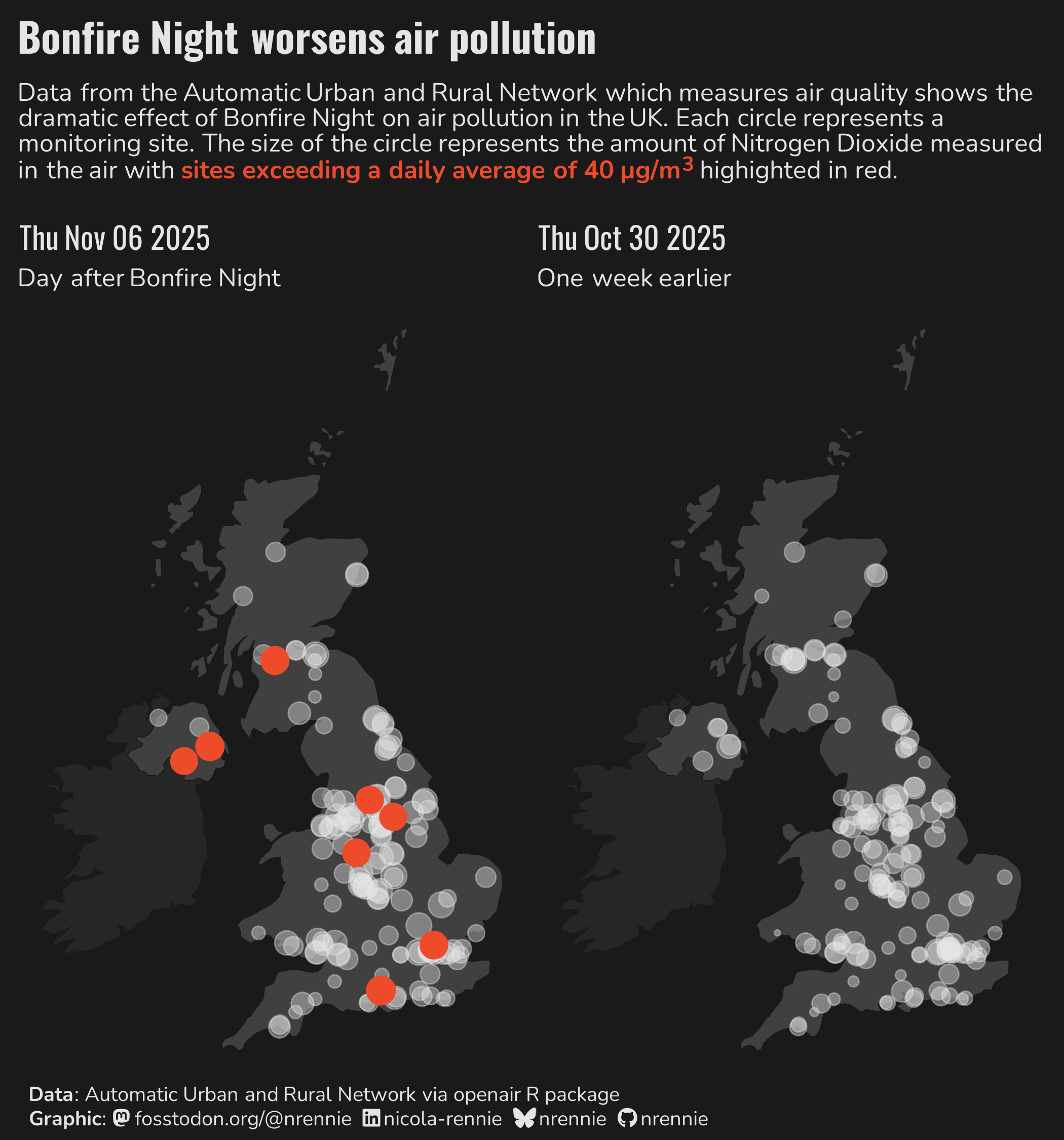It's Day 10 of the #30DayMapChallenge and for the "air" prompt, I decided to look at air quality data before and after Bonfire Night in the UK 🎇