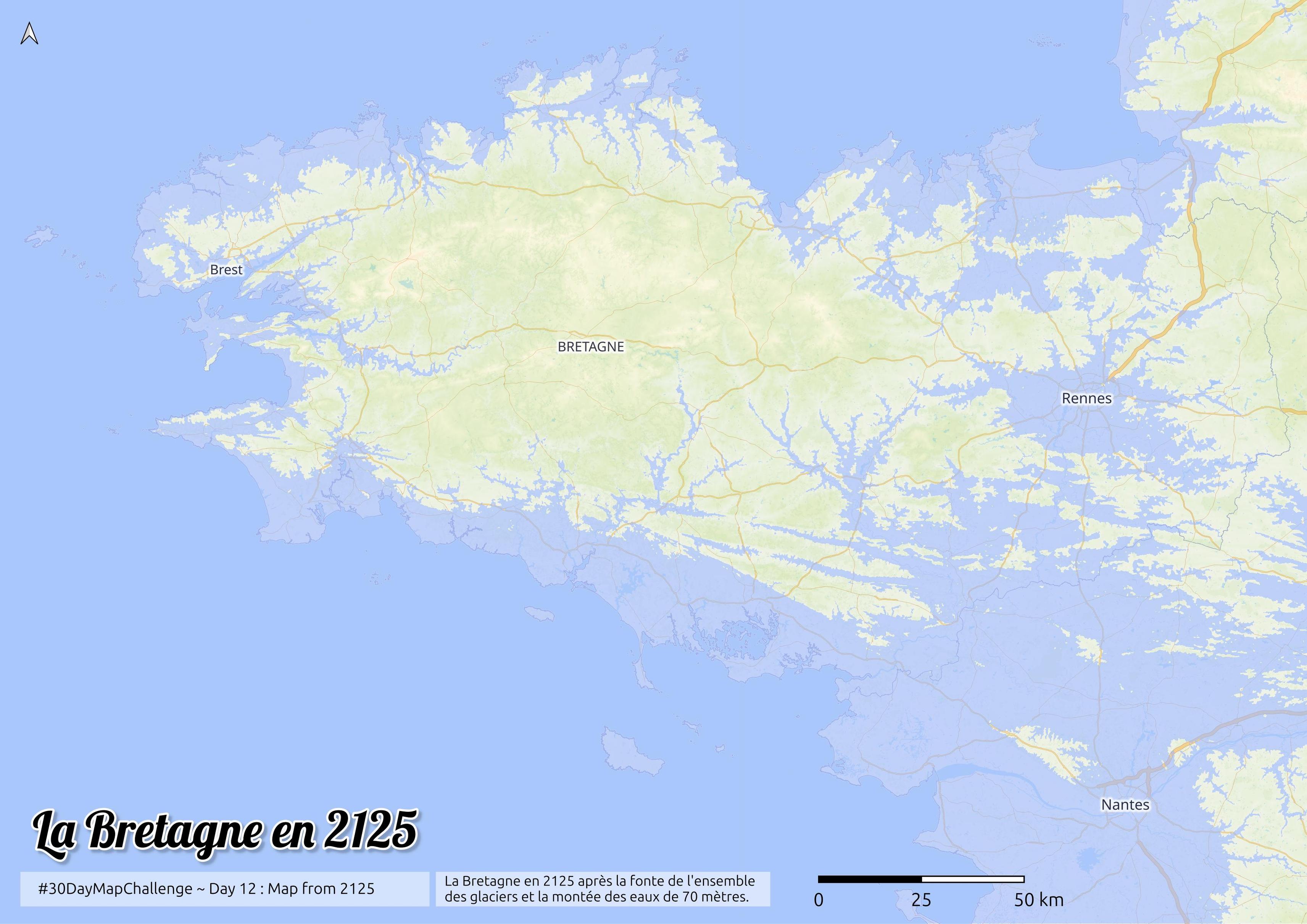 La Bretagne en 2125 après la fonte de l'ensemble des glaciers et la montée des eaux de 70 mètres. #QGIS