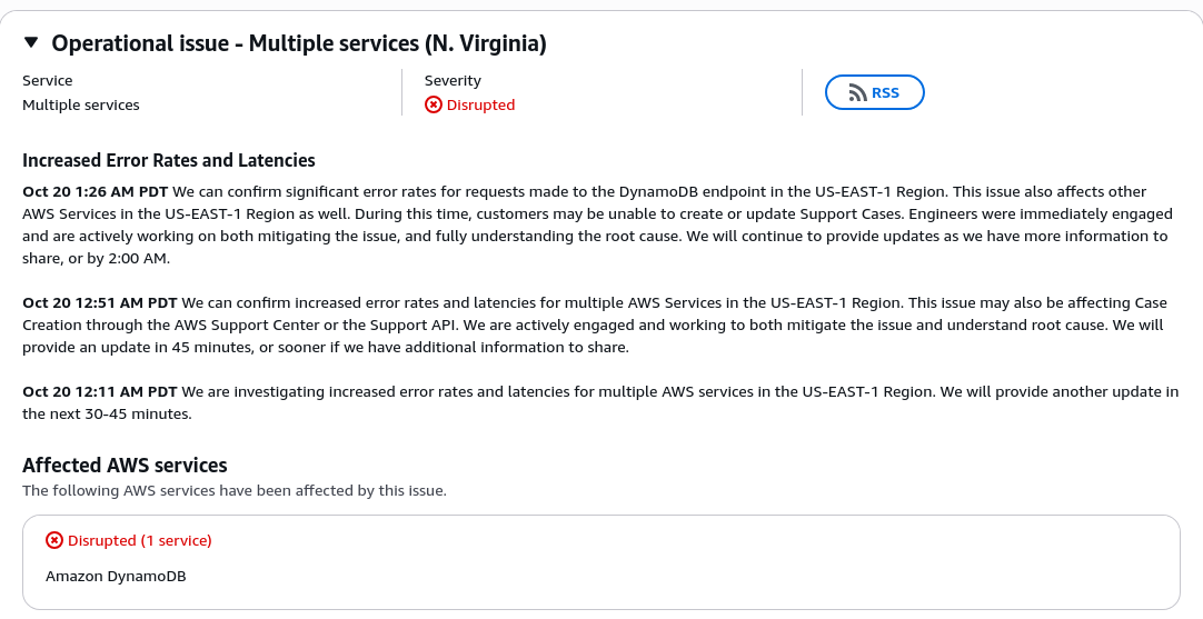 Massive AWS DynamoDB outage ongoing - breaking services like Signal, Coinbase, Hulu, and Snapchat. A stark reminder that the internet is deeply centralized and dangerously dependent on a few mega cloud providers. #AWSdown #InternetStatus