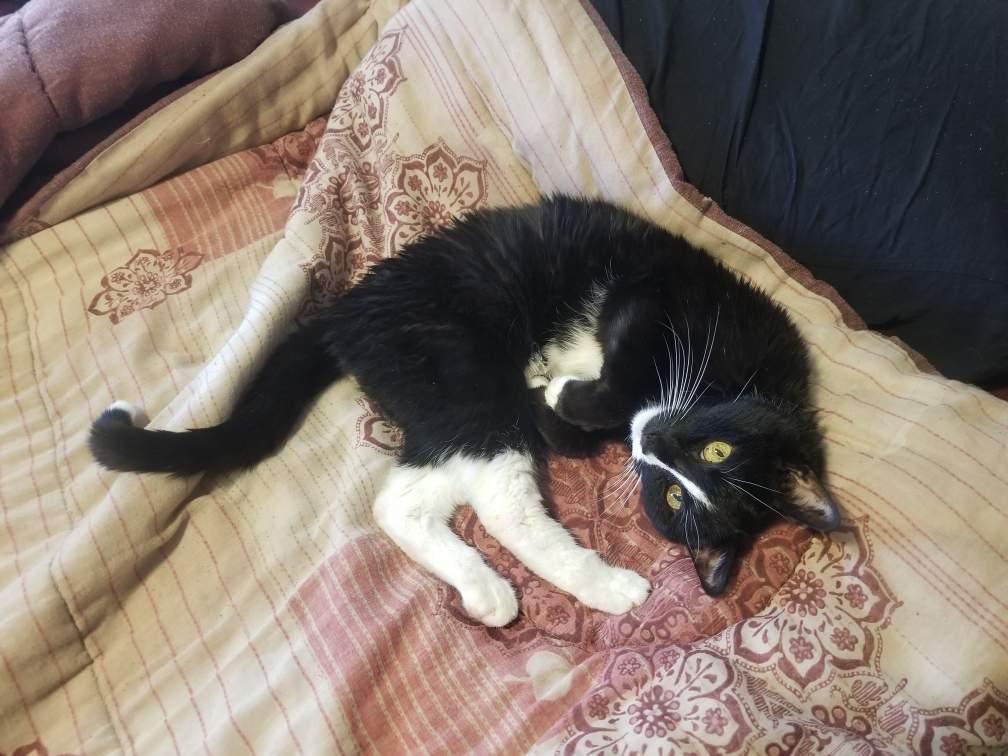 A black and white shorthaired tuxie curled playfully on his side, looking at the camera with bright eyes, his front paws curled to his chest and his back paws long and outstretched. He is Corexit, similar to his little brother Heqat, but he has a long white blaze on his nose and a little white tip on his tail.