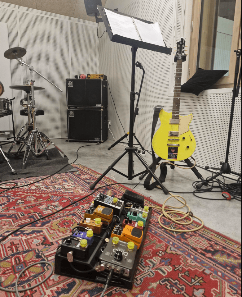 Soirée de répétition avec mon nouveau pedalboard, plus large, mieux rangé niveau câbles et alimentation, et pas beaucoup plus grand que l'ancien. La guitare Yamaha Revstar (en finition Neon Yellow) s'avère vraiment confortable, jamais décevante !