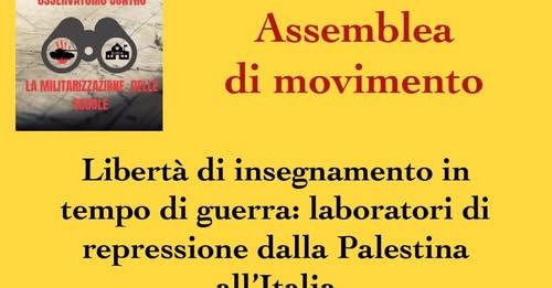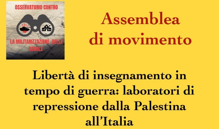 Alla luce degli atti repressivi e di censura che stanno colpendo le scuole L’Osservatorio contro la militarizzazione delle scuole e delle università convoca un’assemblea online per il 29 Dicembre alle 18:00 per preparare per l’inizio del 2026 un’adeguata mobilitazione con tutte le realtà presenti sui territori. https://osservatorionomilscuola.com/2025/12/23/assemblea-29-dicembre-mobilitazione-osservatorio-censura-scuole/