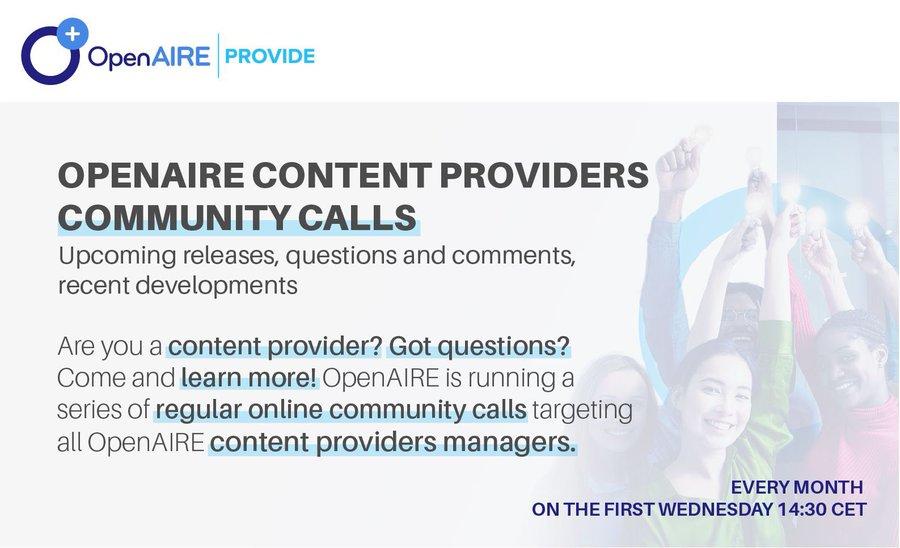 Register 👉 https://www.openaire.eu/community/events/eventdetail/1532/openaire-content-providers-community-call