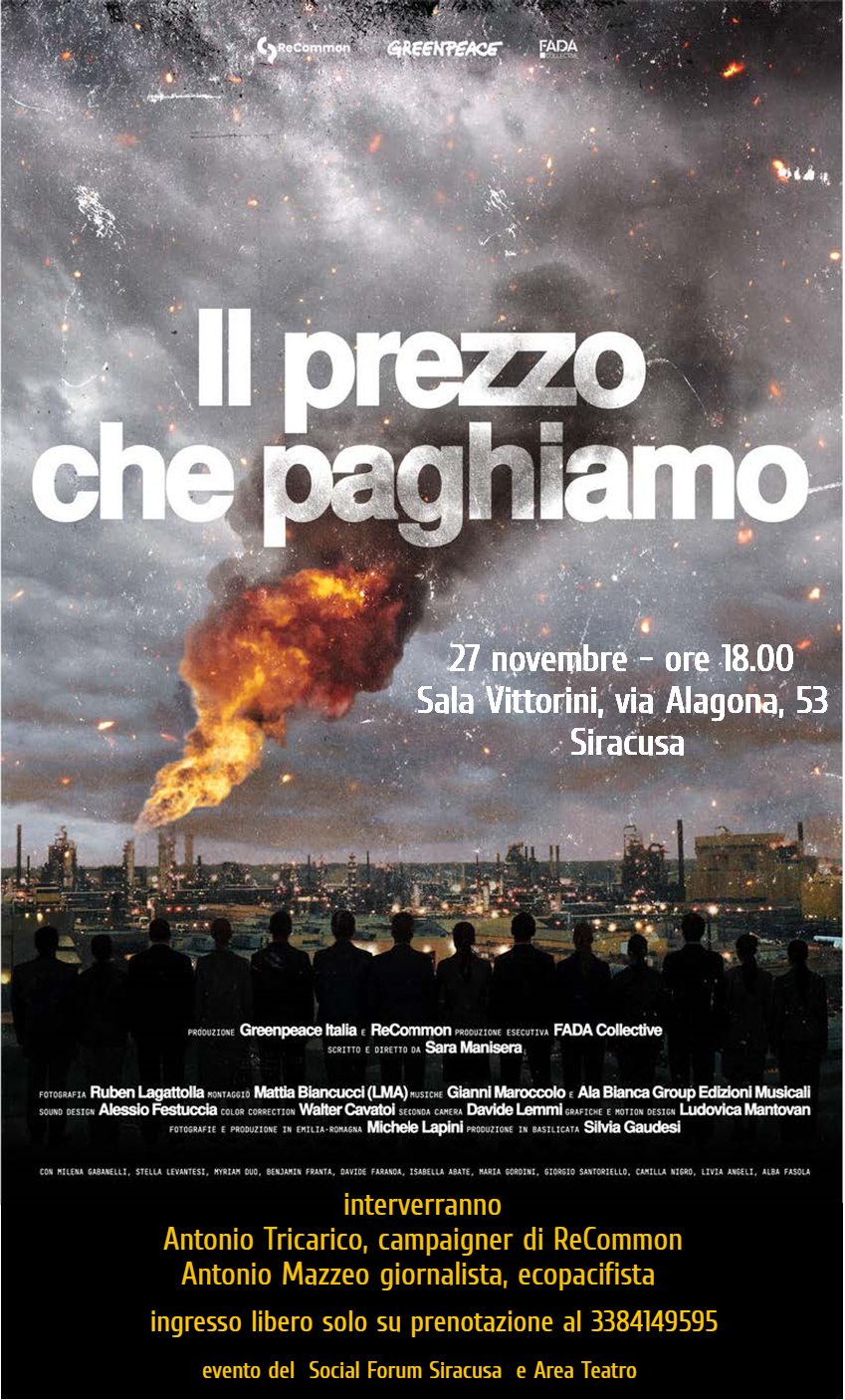 #Siracusa, gioverdì 27 novembre, ore 18. Il prezzo che paghiamo, prodotto da Greenpeace Italia e ReCommon e realizzato da Sara Manisera di FADA Collective, che parla di storie di persone comuni, i cui destini sono condizionati dalla crisi climatica e dall'industria fossile. A termine della proiezione è previsto l’incontro con Antonio Tricarico, compaigner di ReCommon, e Antonio Mazzeo, giornalista ed ecopacifista.