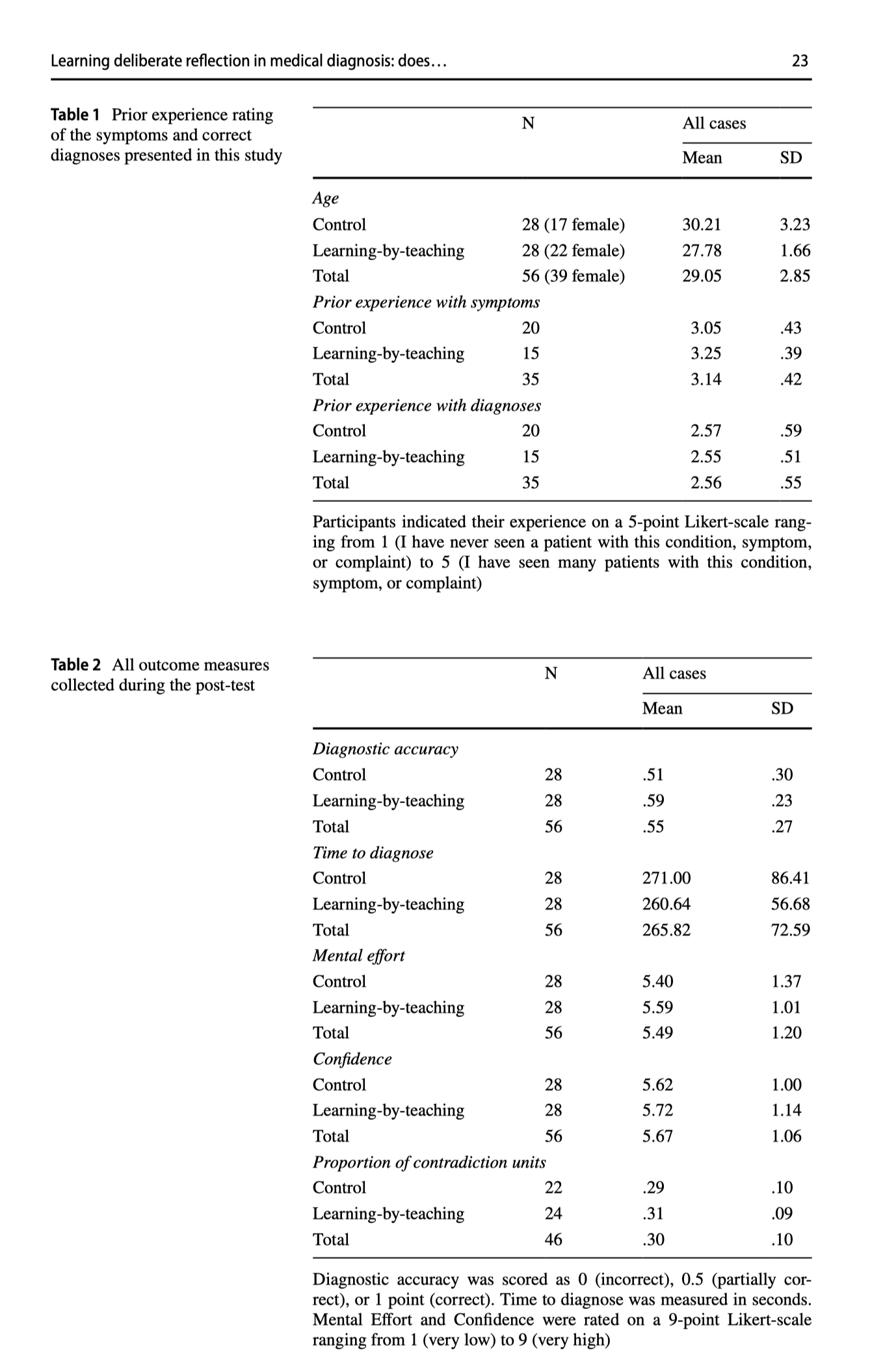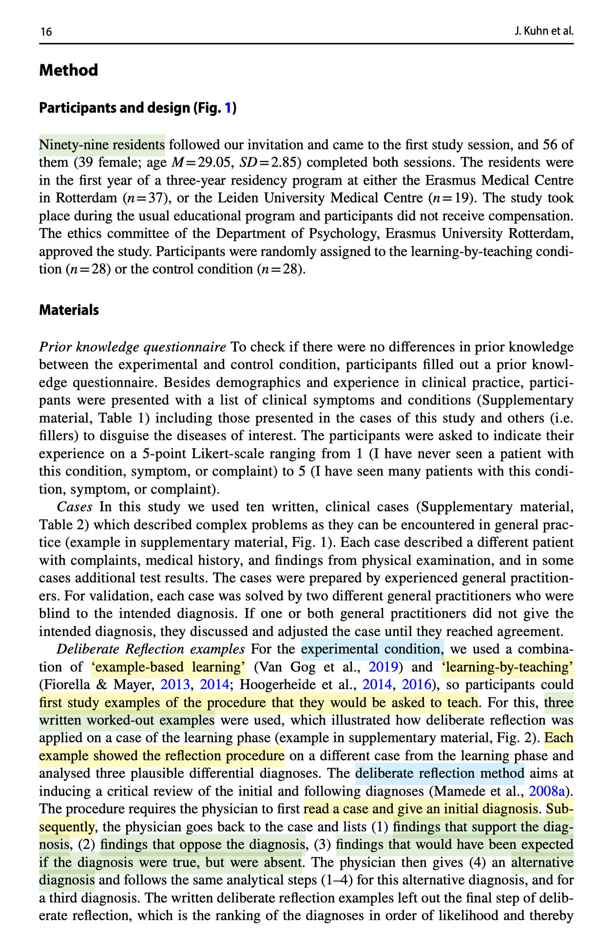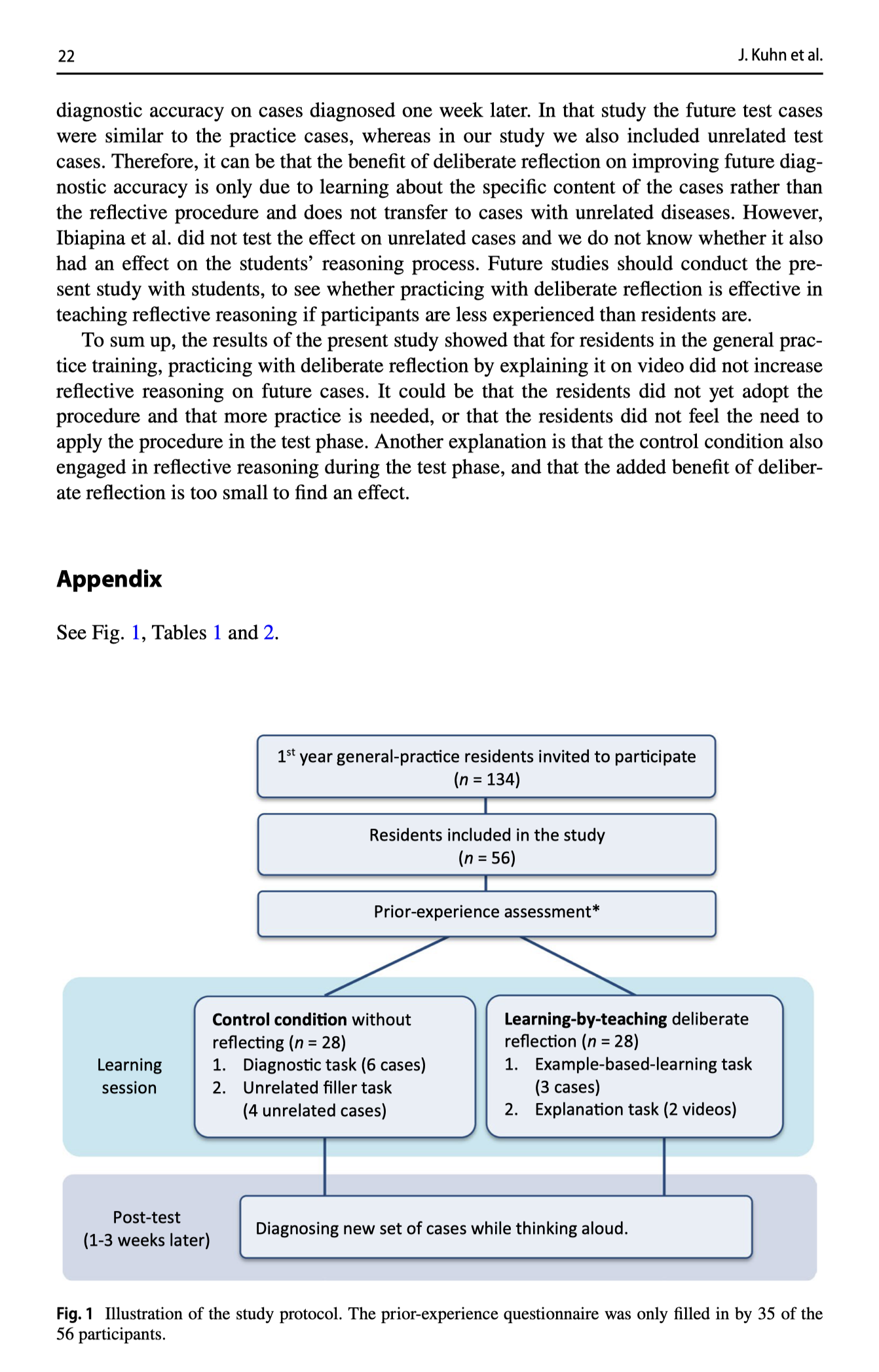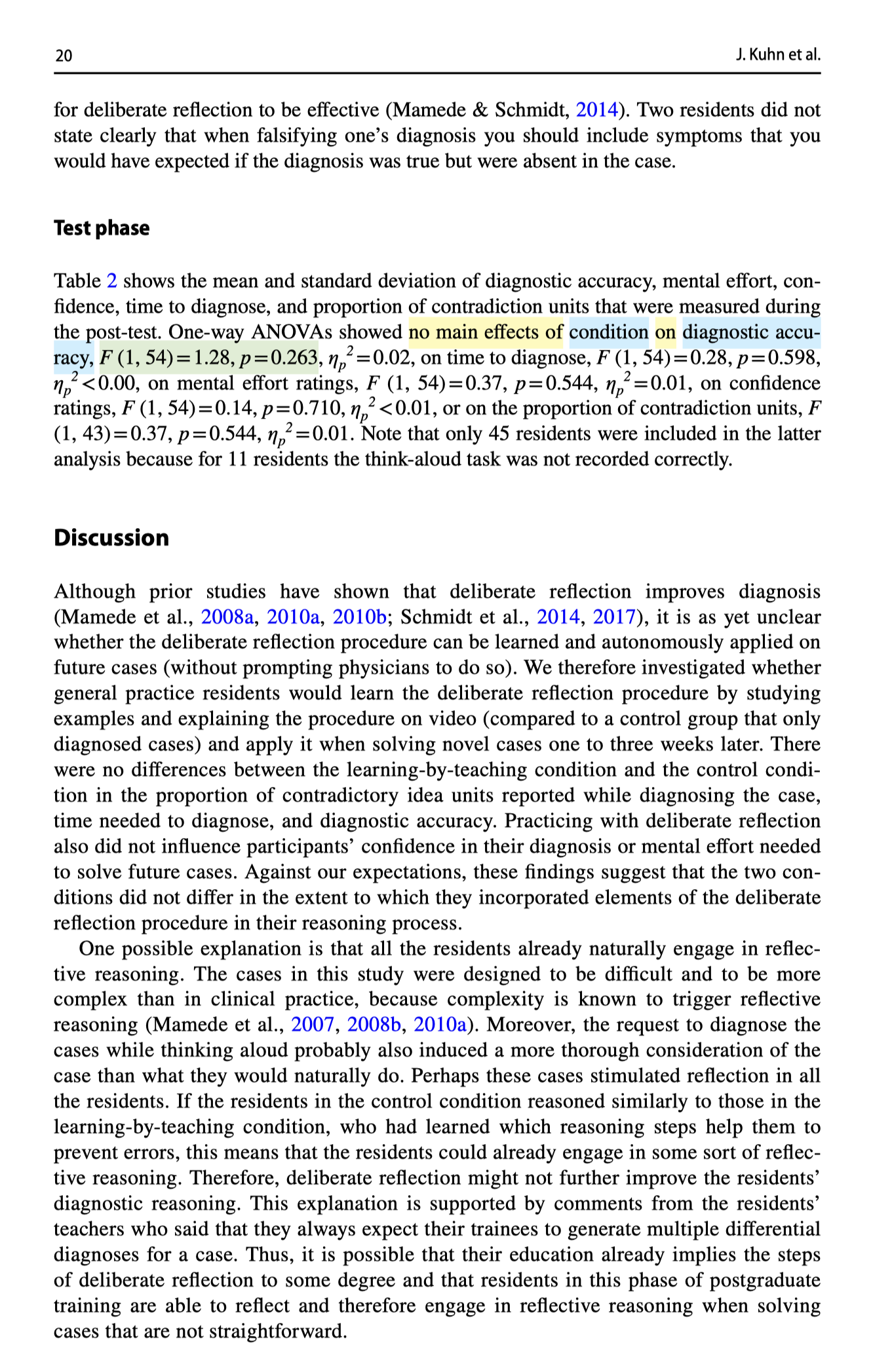 Medical residents randomized to "the experimental condition [studied three] examples of the procedure that they would be asked to teach. ... Each example showed the reflection procedure [which[ requires the physician to first read a case and give an initial diagnosis. Subsequently, the physician goes back to the case and lists (1) findings that support the diagnosis, (2) findings that oppose the diagnosis, (3) findings that would have been expected if the diagnosis were true, but were absent. The physician then gives (4) an alternative diagnosis and follows the same analytical steps (1–4) for this alternative diagnosis, and for a third diagnosis."